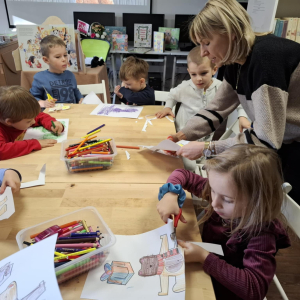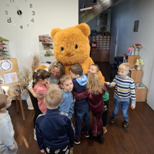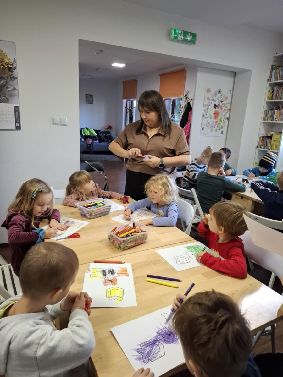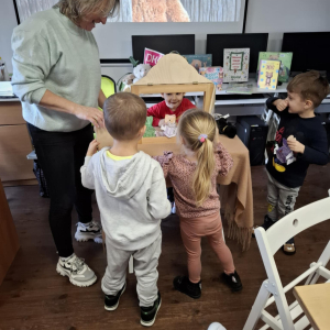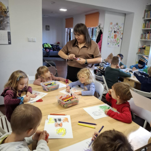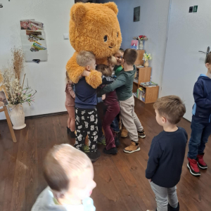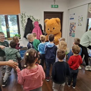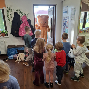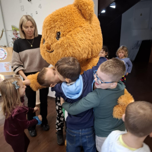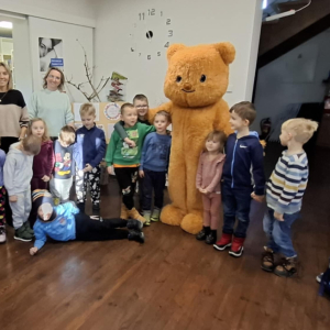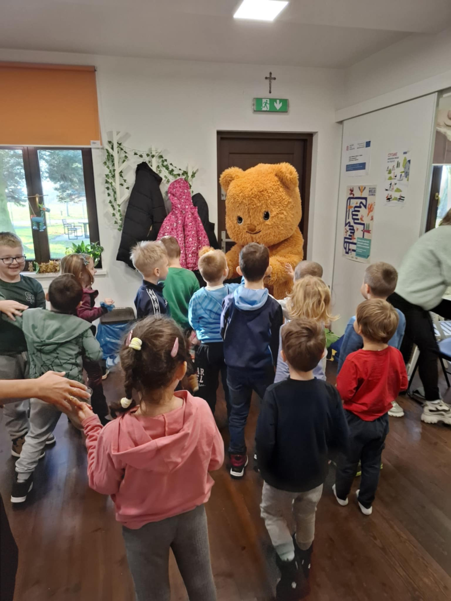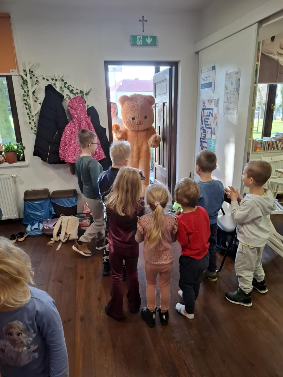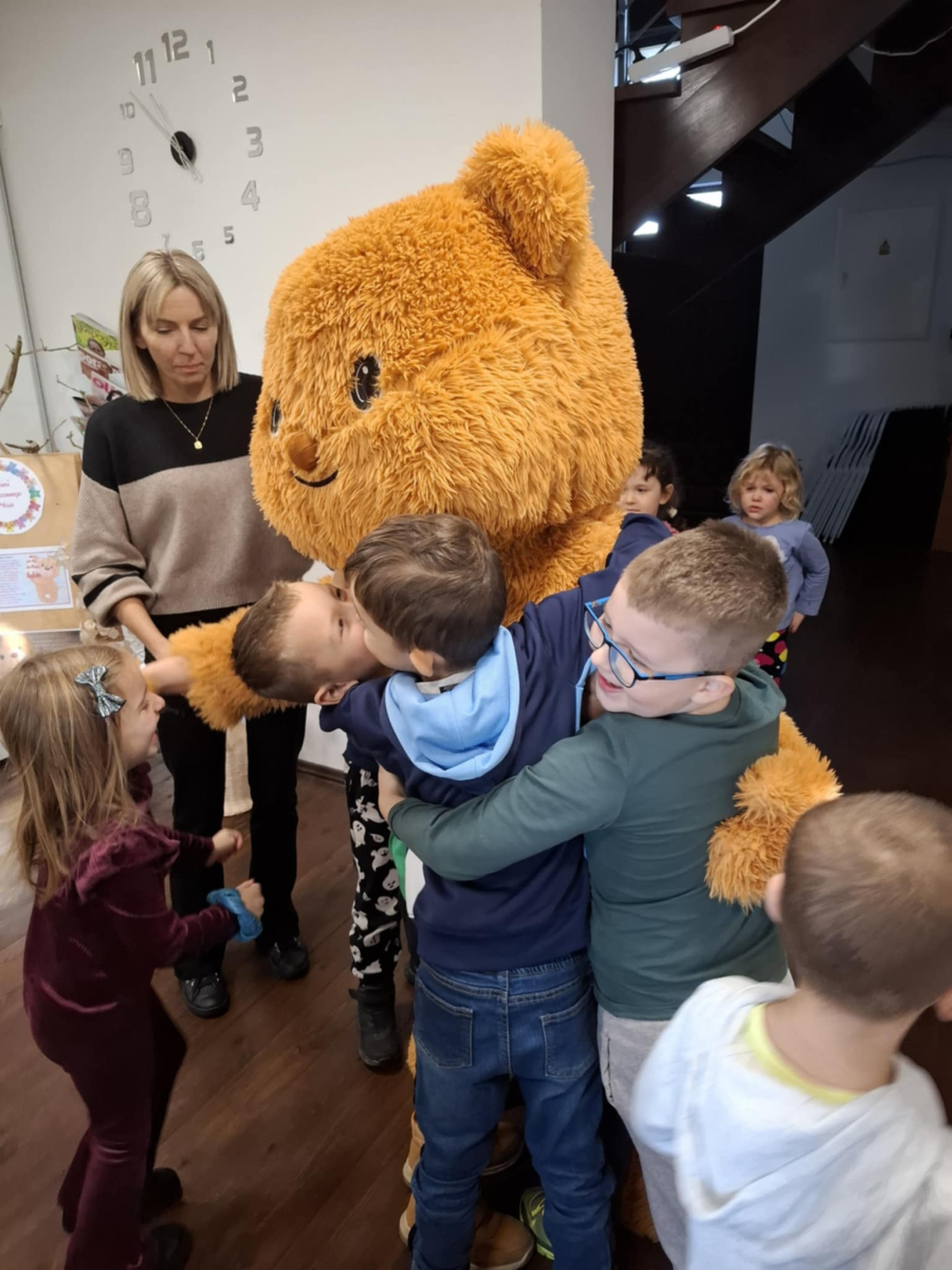 Spotkanie rozpoczęliśmy magiczną podróżą do świata teatru kamishibai. W drewnianej skrzyneczce ożyły ilustracje, a dzieci w skupieniu śledziły losy bohatera, który – tak jak one – kochał swojego pluszaka. Chwilę później na sali pojawił się… prawdziwy pluszowy miś! Gość budził zachwyt, radość i mnóstwo uśmiechu, a każde dziecko mogło przytulić się do niego, poczuć jego miękkie futerko, przybić "misiową piątkę" i zrobić wspólne zdjęcie. Miś zaprosił również dzieci do wspólnej zabawy. Były wesołe pląsy, „misiowa gimnastyka” i wyścig w przekazywaniu pluszaka. Nie zabrakło też misiowych zagadek — dzieci musiały odgadnąć, który miś uwielbia miód, który mieszka w bajce, a który potrafi liczyć do dziesięciu. Na zakończenie mali uczestnicy wyruszyli w najbardziej twórczą część spotkania. Korzystając z przygotowanego szablonu, każdy przedszkolak wykonał własnego przyjaciela misia. Powstała cała galeria kolorowych, fantastycznie ozdobionych prac, które pokazały, jak niezwykła potrafi być dziecięca wyobraźnia.
