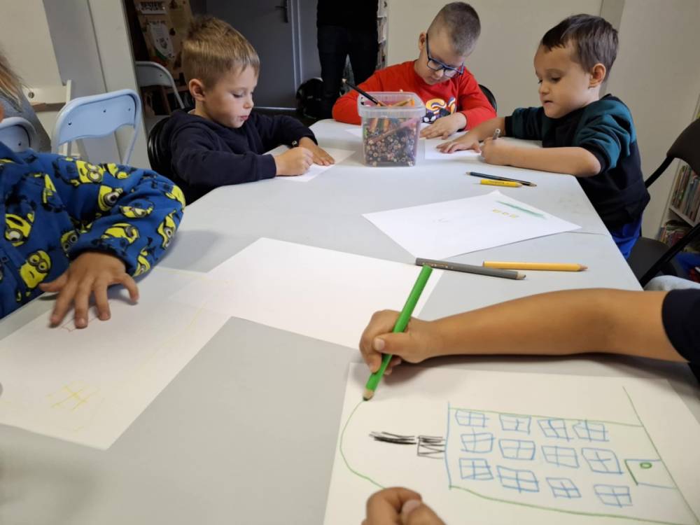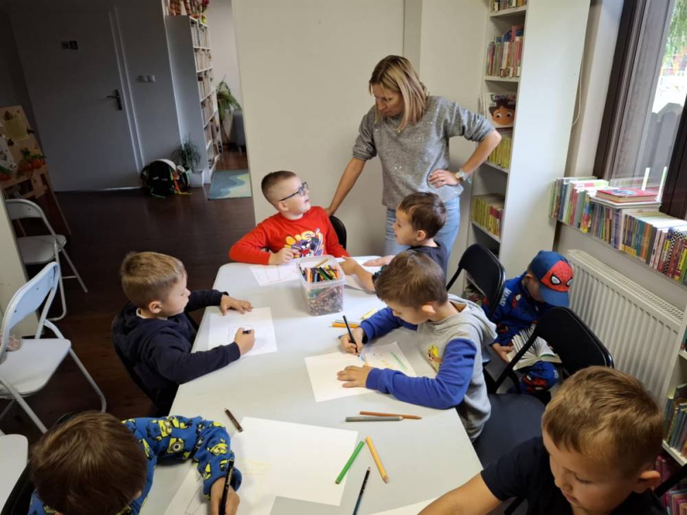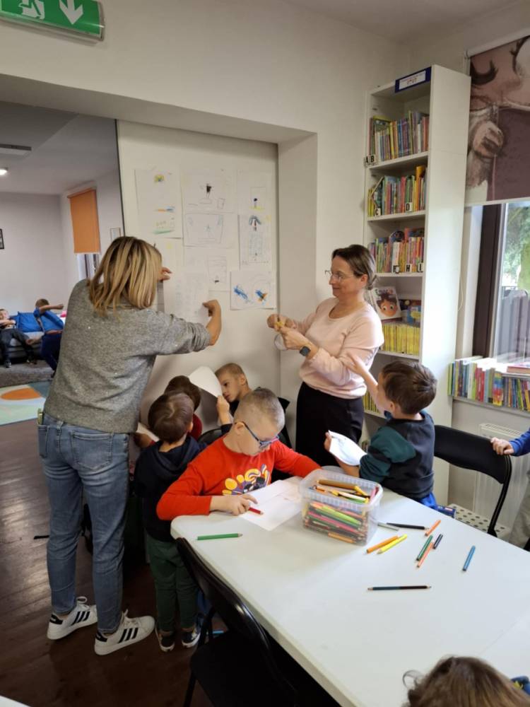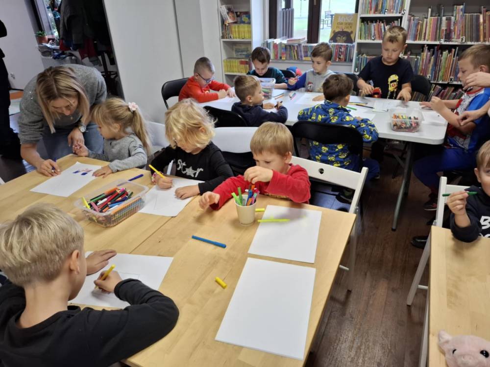Drugą część wydarzenia stanowiły zajęcia plastyczne. Dzieci, zainspirowane wysłuchanym tekstem, stworzyły barwne ilustracje przedstawiające pokój, w którym Czarny Nosek mógłby poczuć się dobrze i swobodnie. Powstałe prace zaskakiwały bogactwem wyobraźni i dowodziły, jak silnym impulsem twórczym może być kontakt z literaturą.