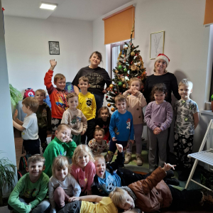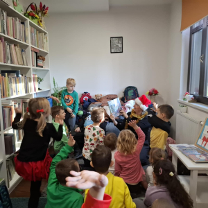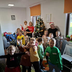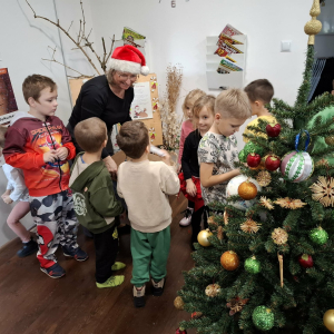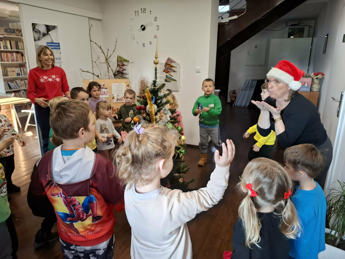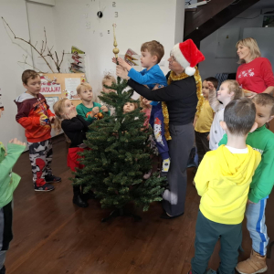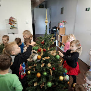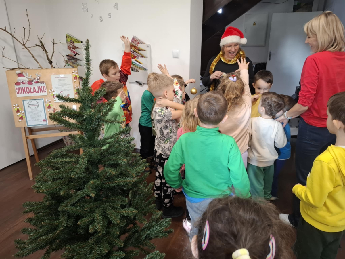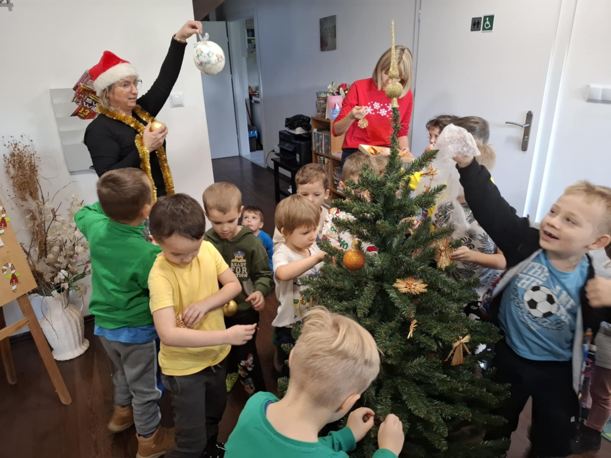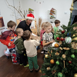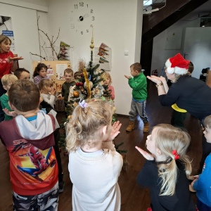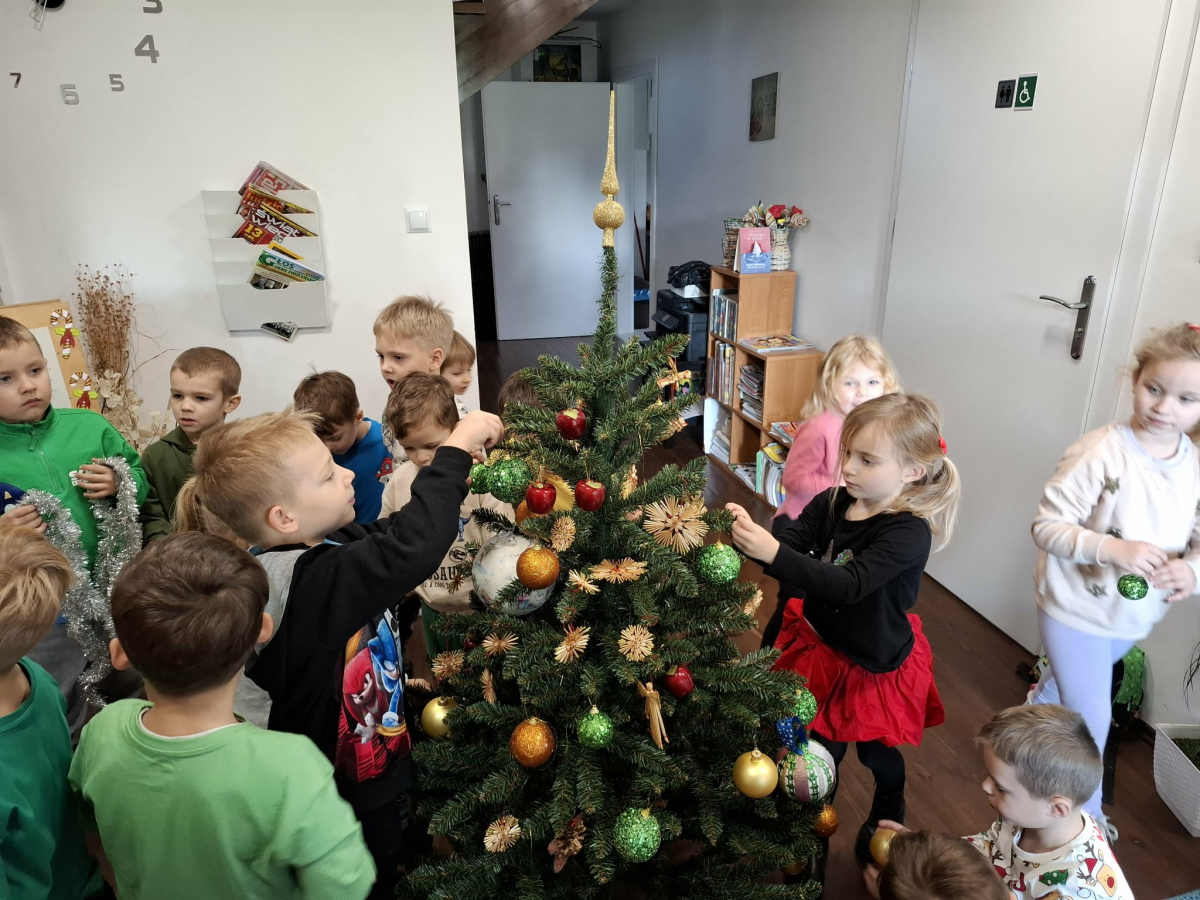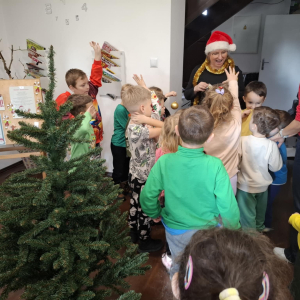 A potem… nadszedł moment, na który czekały wszystkie dzieci — ubieranie bibliotecznej choinki. Początkiem tej świątecznej misji było uroczyste założenie czubka przez najmłodsze dziecko z grupy. To nasza piękna tradycja, do której od lat zapraszamy przedszkolaki. Mali pomocnicy zawieszali ozdoby z radością i pełnym zaangażowaniem. Kiedy choinka rozbłysła świątecznym blaskiem, wszyscy połączyliśmy się w wesołym tańcu wokół drzewka. Nie zabrakło też ulubionych zabaw świątecznych, które porwały do ruchu nawet najbardziej nieśmiałych uczestników.