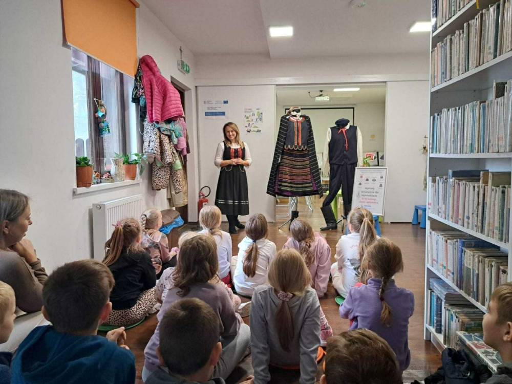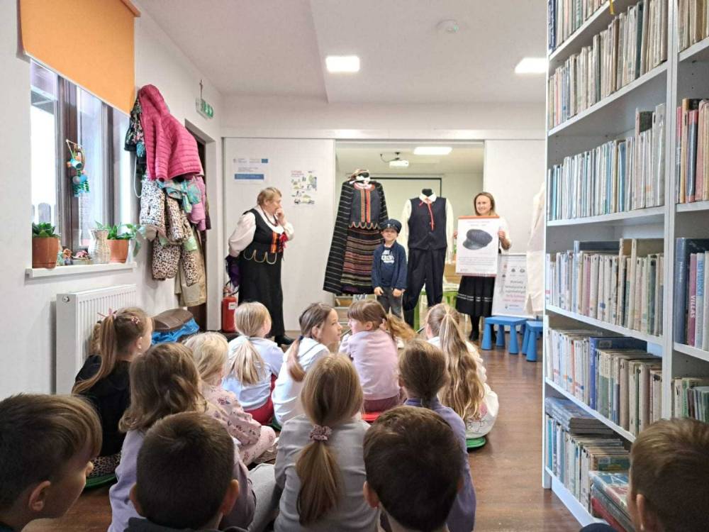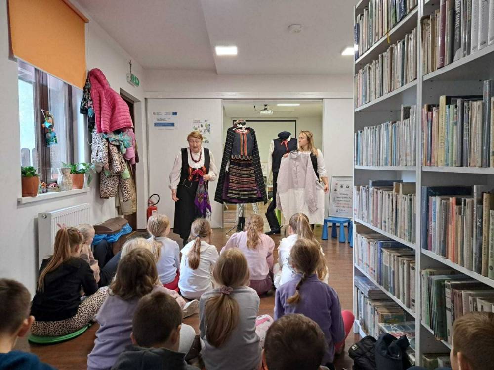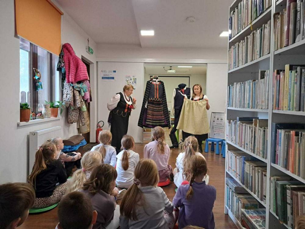 W dniu 8 października w naszej biibliotece odbyło się ciekawe spotkanie poświęcone radomskiemu strojowi ludowemu. Wykład poprowadziły panie z Koła Gospodyń Wiejskich w Grabowie nad Wisłą, które w barwny i interesujący sposób opowiedziały o tradycjach ludowych naszego regionu. Słuchaczami były dzieci z klasy II Publicznej Szkoły Podstawowej w Grabowie nad Wisłą wraz z wychowawczynią. Podczas spotkania uczniowie mieli okazję zobaczyć oryginalne elementy stroju radomskiego – piękne spódnice w kolorowe pasy, wyszywane gorsety, zapaski, a także charakterystyczne chusty i korale. Panie z KGW opowiedziały o tym, jak dawniej wyglądał strój codzienny i odświętny, jakie znaczenie miały kolory i wzory oraz z jakich materiałów szyto ubrania. Dzieci z dużym zainteresowaniem słuchały opowieści, a także zadawały wiele pytań. Nie zabrakło też wspólnej zabawy – uczniowie mogli przymierzyć niektóre elementy stroju oraz zrobić sobie pamiątkowe zdjęcie.