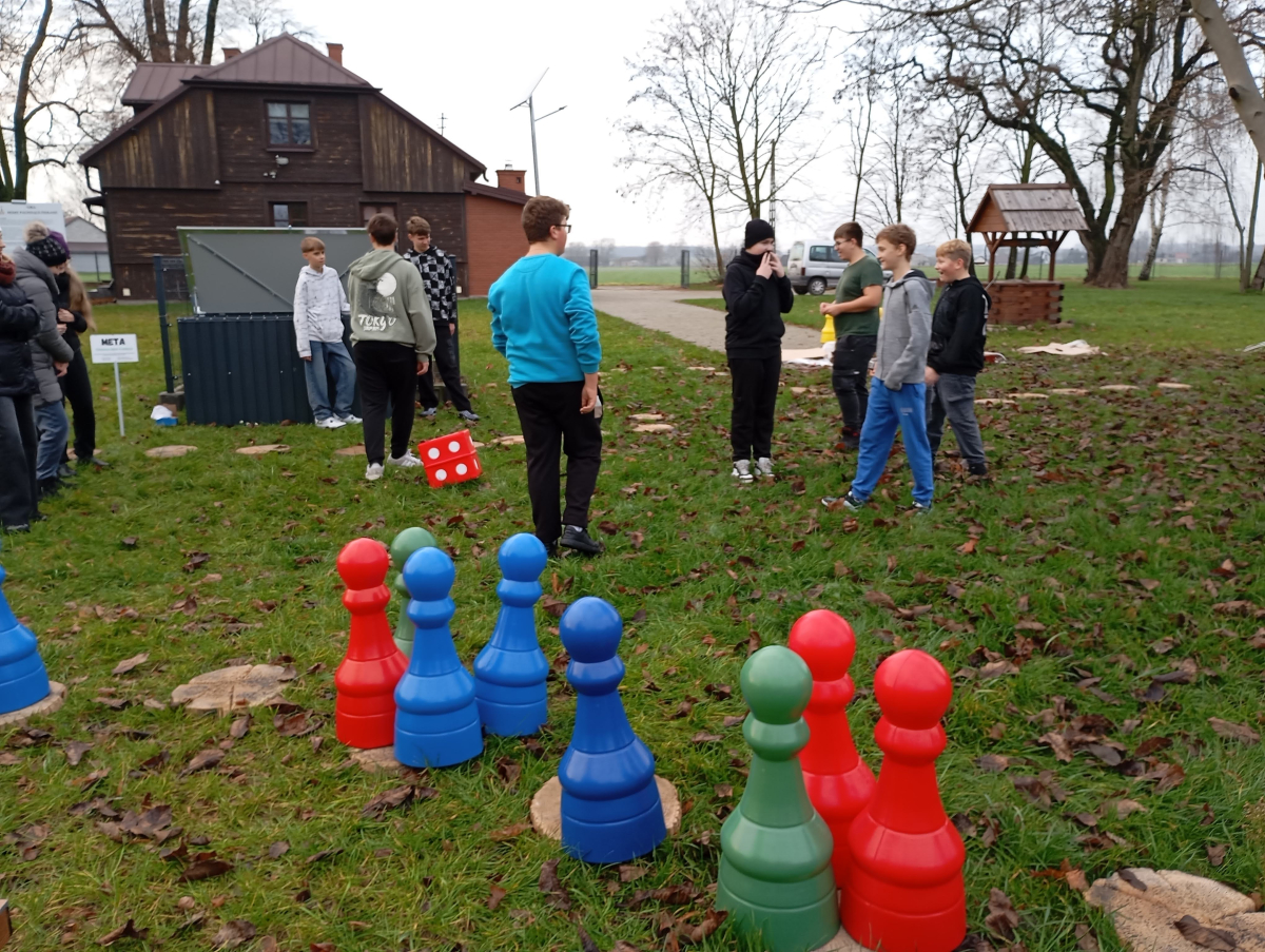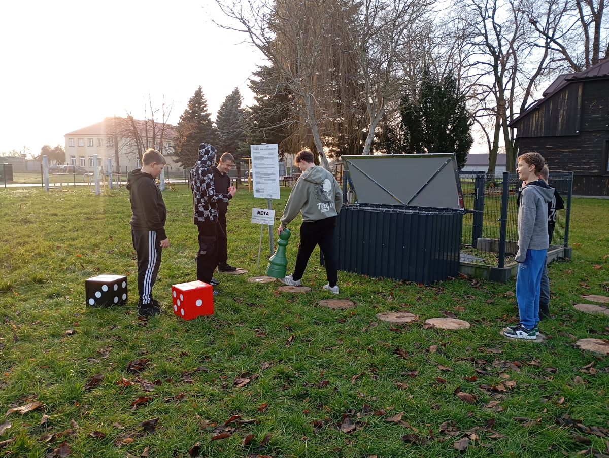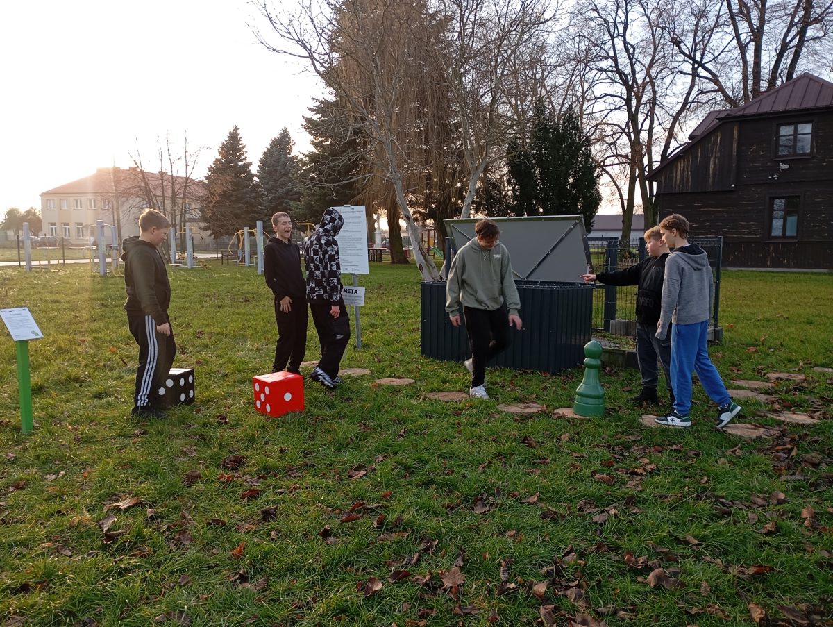 Dziś młodzież z PSP w Grabowie nad Wisłą po raz pierwszy miała okazję zagrać w wielkoformatową grę planszową, ktora postała na placu przy naszej bibliotece. Byli oni nie tylko ciekawymi gośćmi – ale przede wszystkim jej współtwórcami. To wyjątkowy moment, kiedy pomysły, które jeszcze niedawno istniały jedynie na kartkach notesu, w szkicach i burzach mózgów, zamieniły się w prawdziwą, angażującą rozgrywkę.