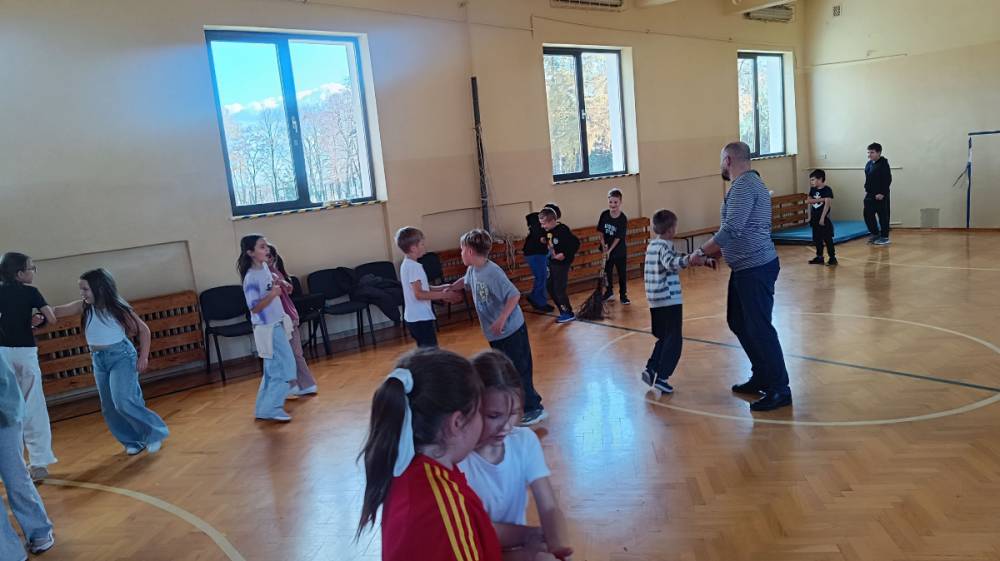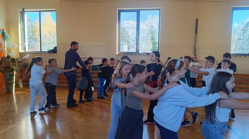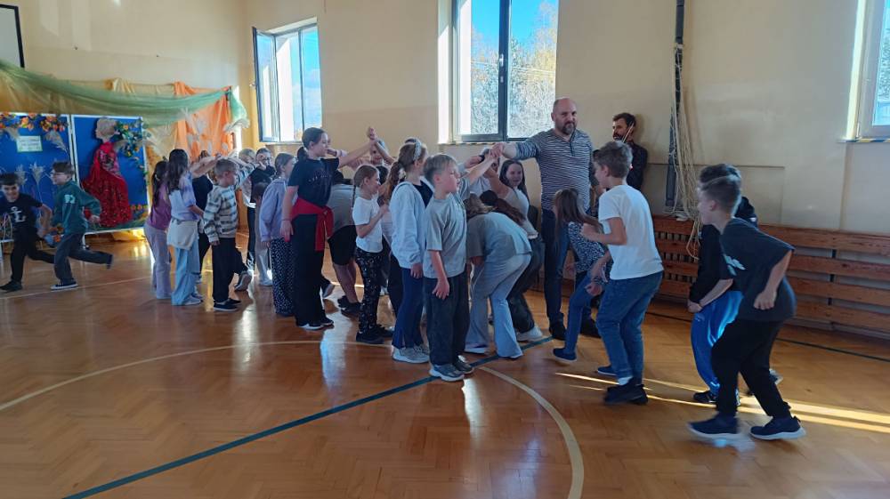 Krakowiak – taneczna forma zabawy, podczas której dzieci uczyły się podstawowych kroków i figur charakterystycznych dla polskiego tańca narodowego. Wspólne tańczenie w parach sprawiło uczniom mnóstwo radości i pozwoliło poczuć klimat ludowej muzyki.