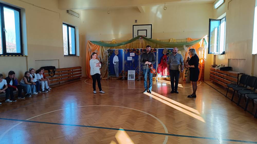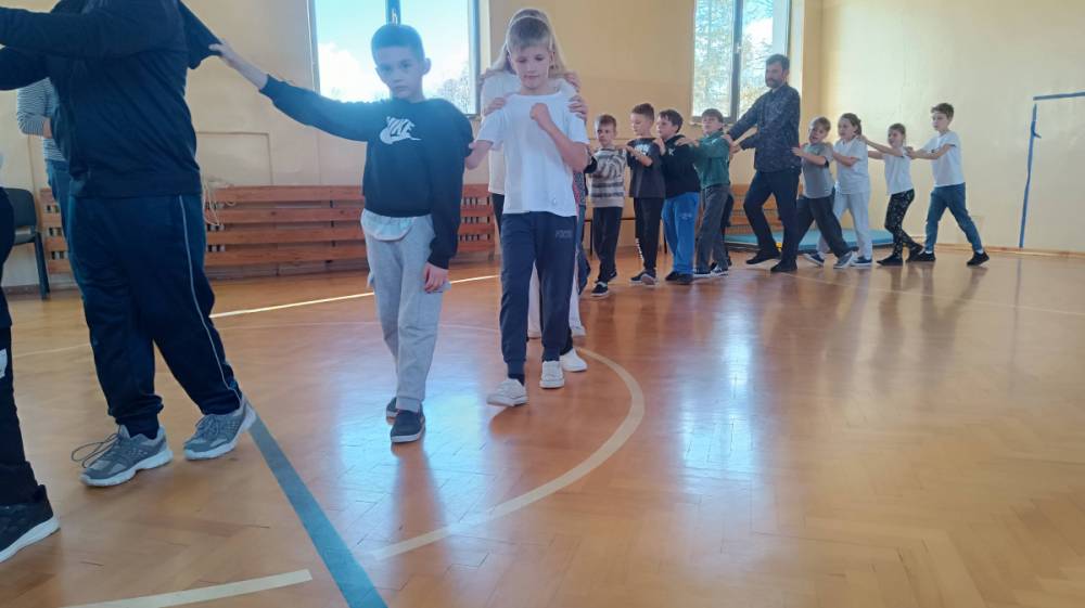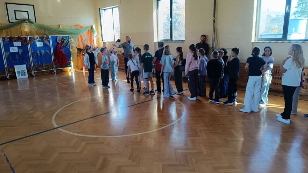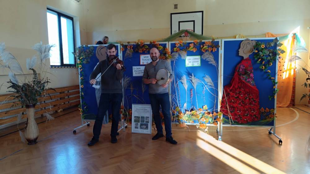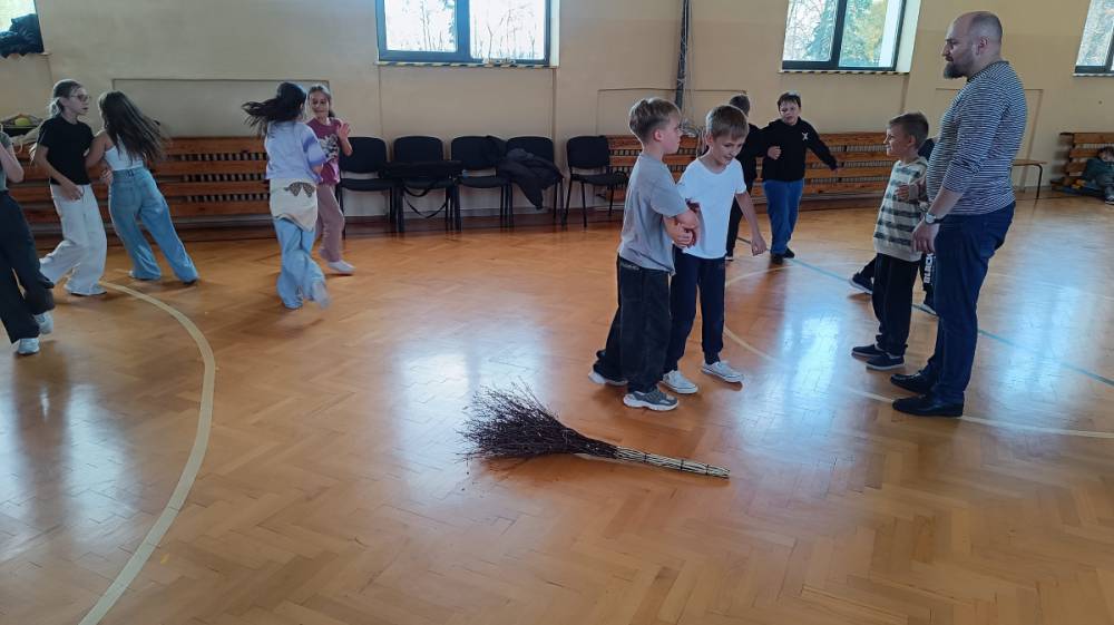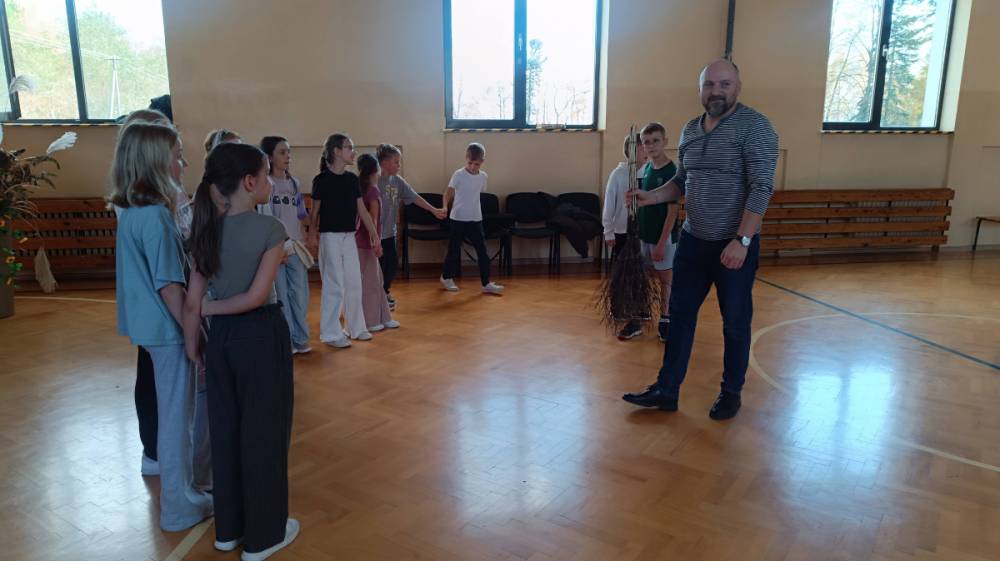 Zajęcia poprowadzili znakomici animatorzy: Czesław Pióro – etnolog, pedagog i animator kultury, który towarzyszył dzieciom, grając na bębenku, oraz Mateusz Niwiński – skrzypek, etnolog i pedagog, kultywujący tradycyjną manierę gry charakterystyczną dla Polski Centralnej (m.in. od Piotra Gacy ze Rdzowa). Ich pasja i energia sprawiły, że uczniowie z ogromnym entuzjazmem przenieśli się w świat dawnych zabaw i melodii ludowych.