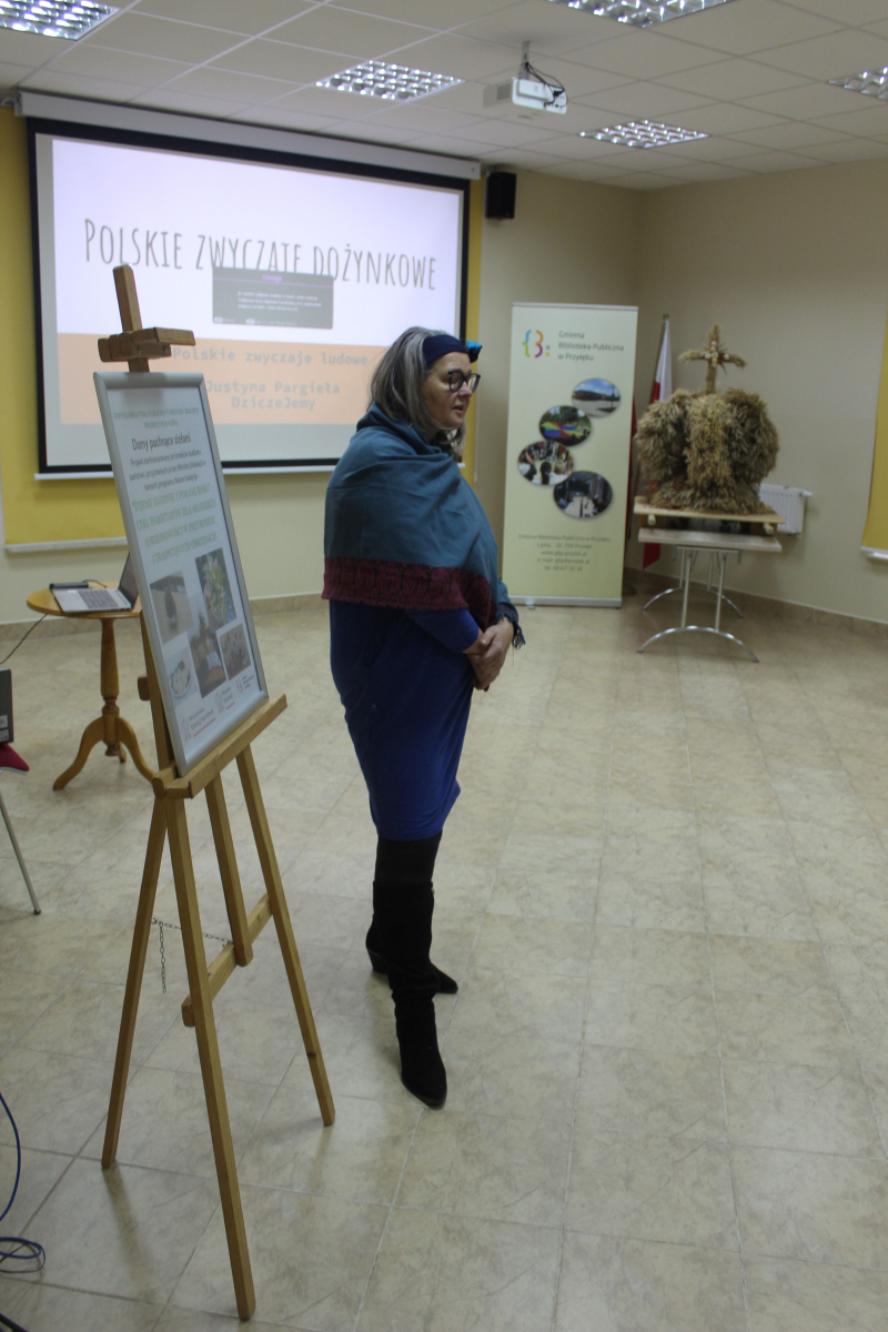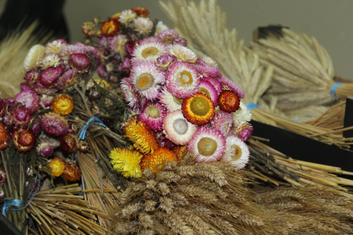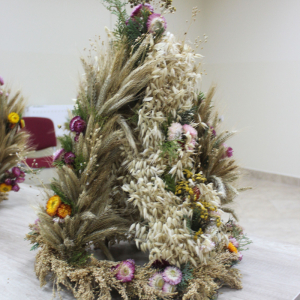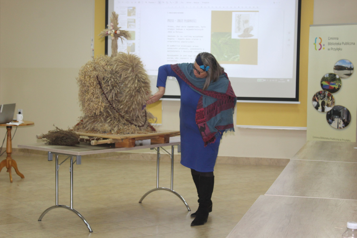 Szczególną uwagę prowadząca poświęciła roślinom wykorzystywanym w tradycyjnych wieńcach dożynkowych. Omówiła poszczególne gatunki zbóż, ziół i kwiatów, które od pokoleń tworzą dożynkowe kompozycje: pszenicę, żyto, owies, mak, owies, kąkol, rumianek, ruta, dziurawiec, a także liczne rośliny polne i łąkowe. Podkreśliła przy tym, że tradycyjny wieniec dożynkowy miał zawsze kształt korony, symbolizując wdzięczność za plony oraz prośbę o urodzaj na kolejny rok. Zwróciła uwagę, że coraz częściej spotykane współcześnie wieńce o fantazyjnych formach nie powinny nosić tej nazwy – właściwym określeniem dla nich są ozdoby dożynkowe.