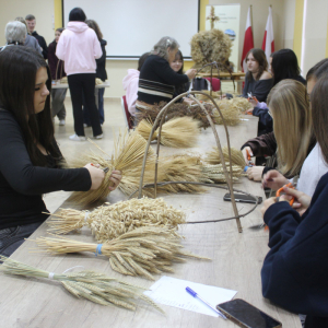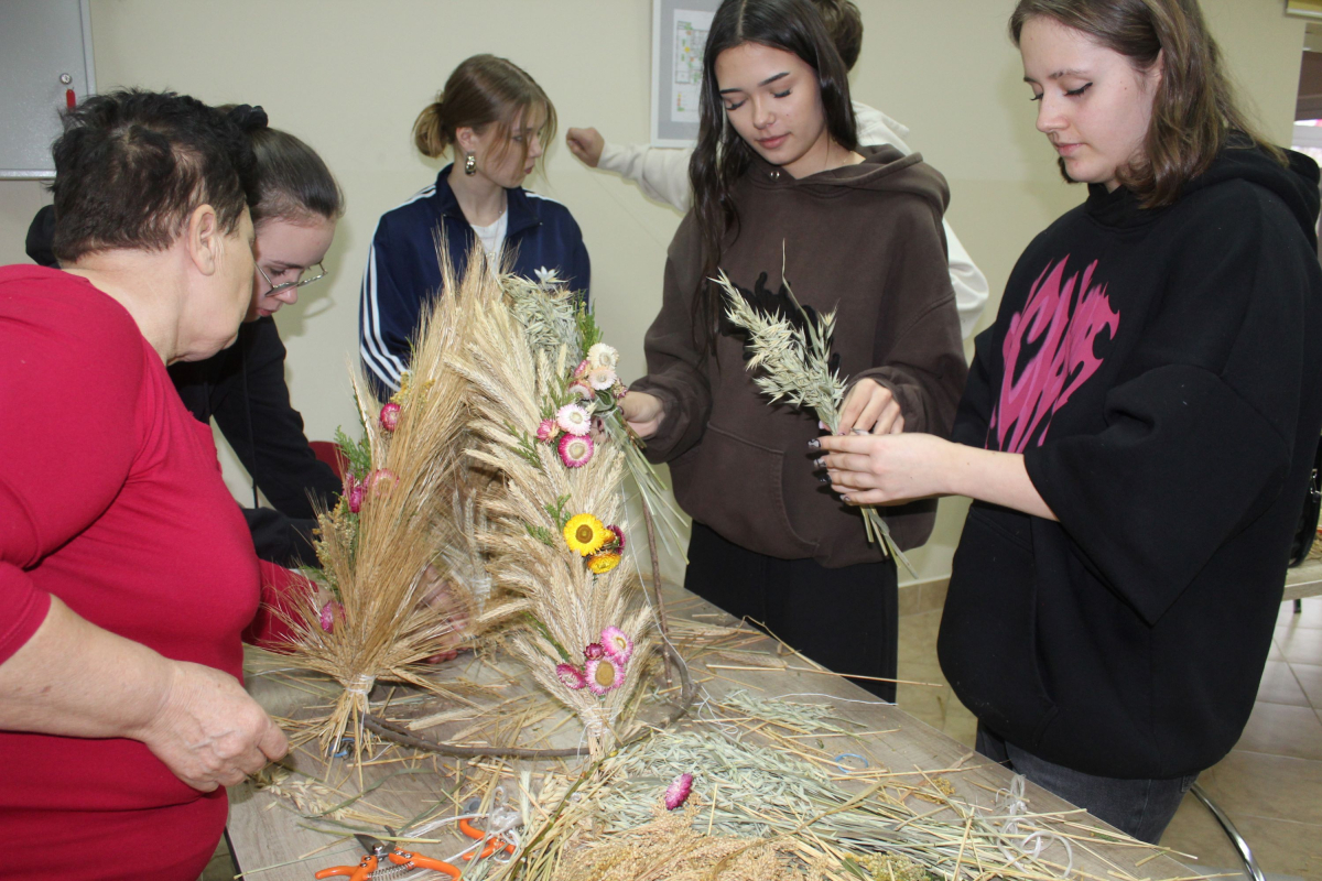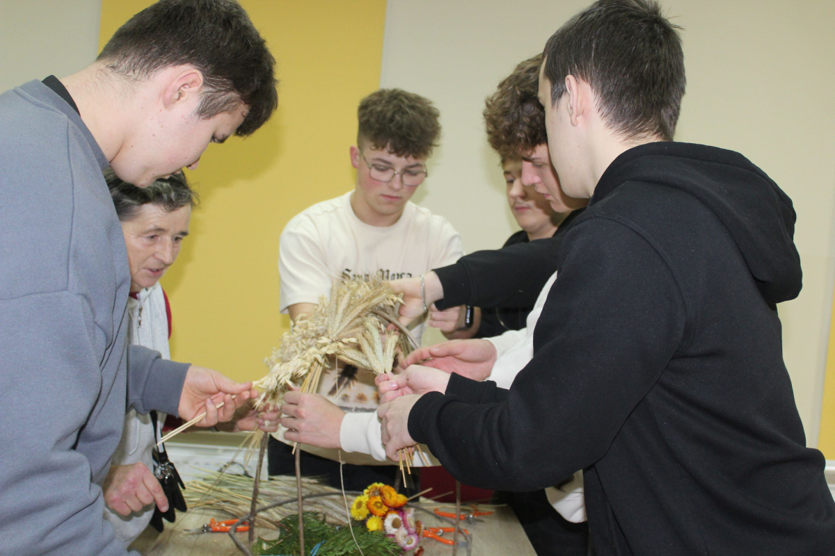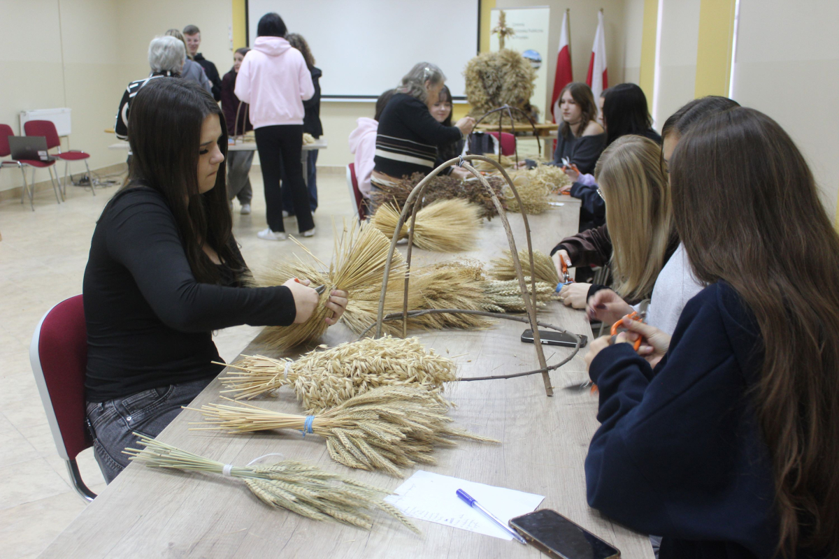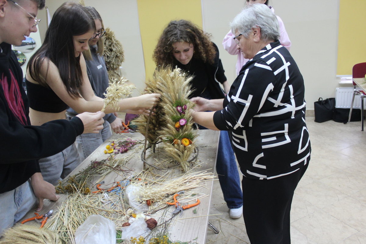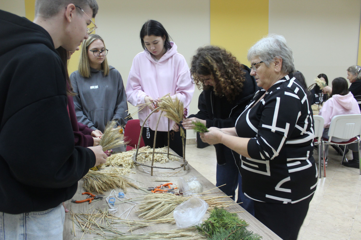 Druga część warsztatów została poprowadzona przez członkinie Koła Gospodyń Wiejskich w Łaguszowie z ponad 50-letnim doświadczeniem w wiciu wieńców, za które otrzymywały liczne nagrody. Panie wprowadziły młodzież w praktyczną stronę tradycji dożynkowych. Uczniowie uczyli się wykonywania miniaturowych wieńców dożynkowych, poznając techniki plecenia i łączenia poszczególnych elementów.