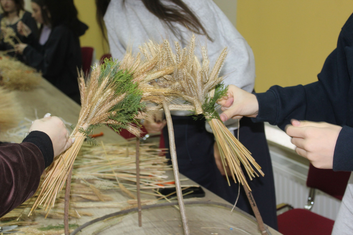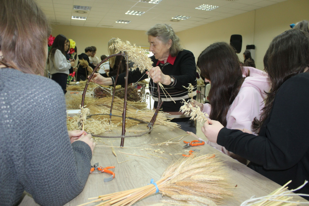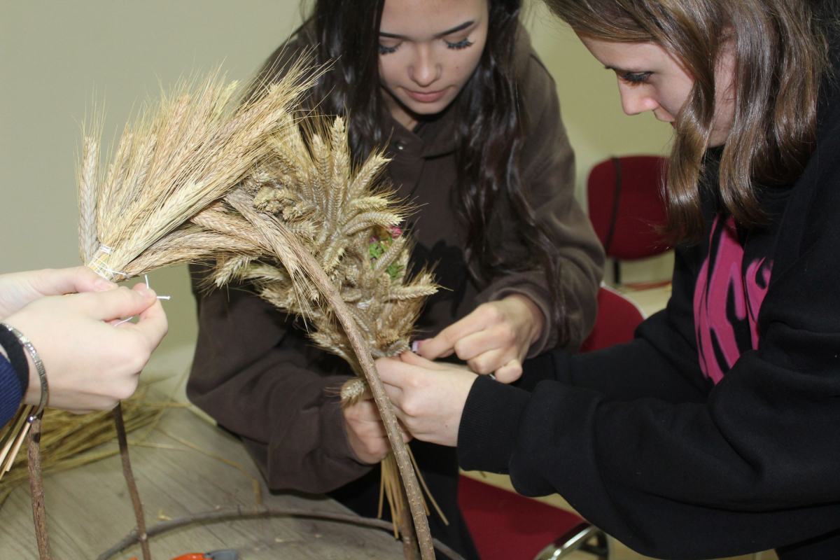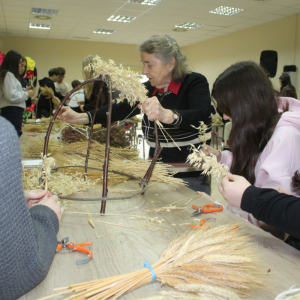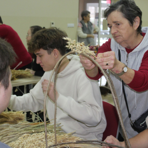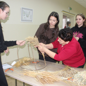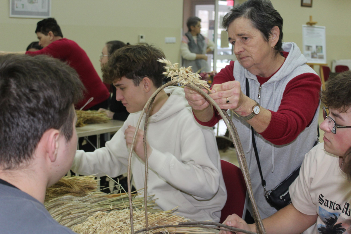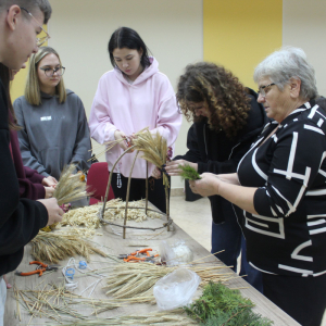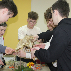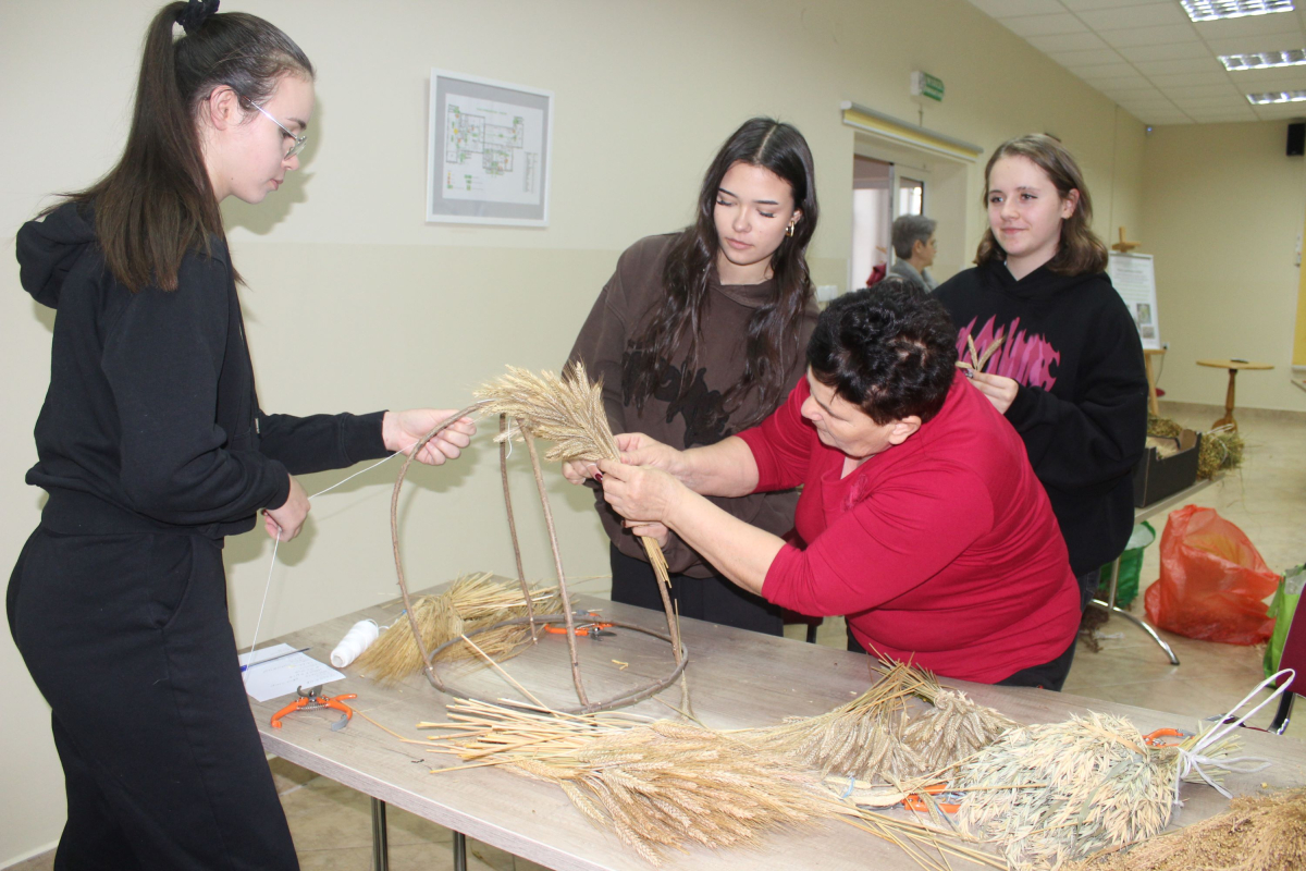 Druga część warsztatów została poprowadzona przez członkinie Koła Gospodyń Wiejskich w Łaguszowie z ponad 50-letnim doświadczeniem w wiciu wieńców, za które otrzymywały liczne nagrody. Panie wprowadziły młodzież w praktyczną stronę tradycji dożynkowych. Uczniowie uczyli się wykonywania miniaturowych wieńców dożynkowych, poznając techniki plecenia i łączenia poszczególnych elementów.