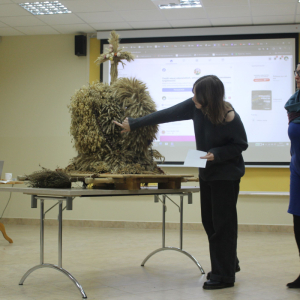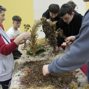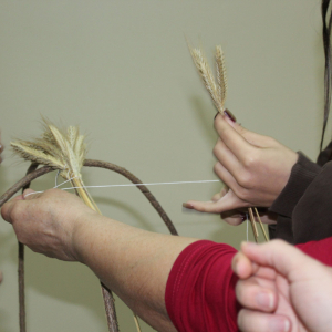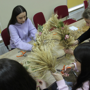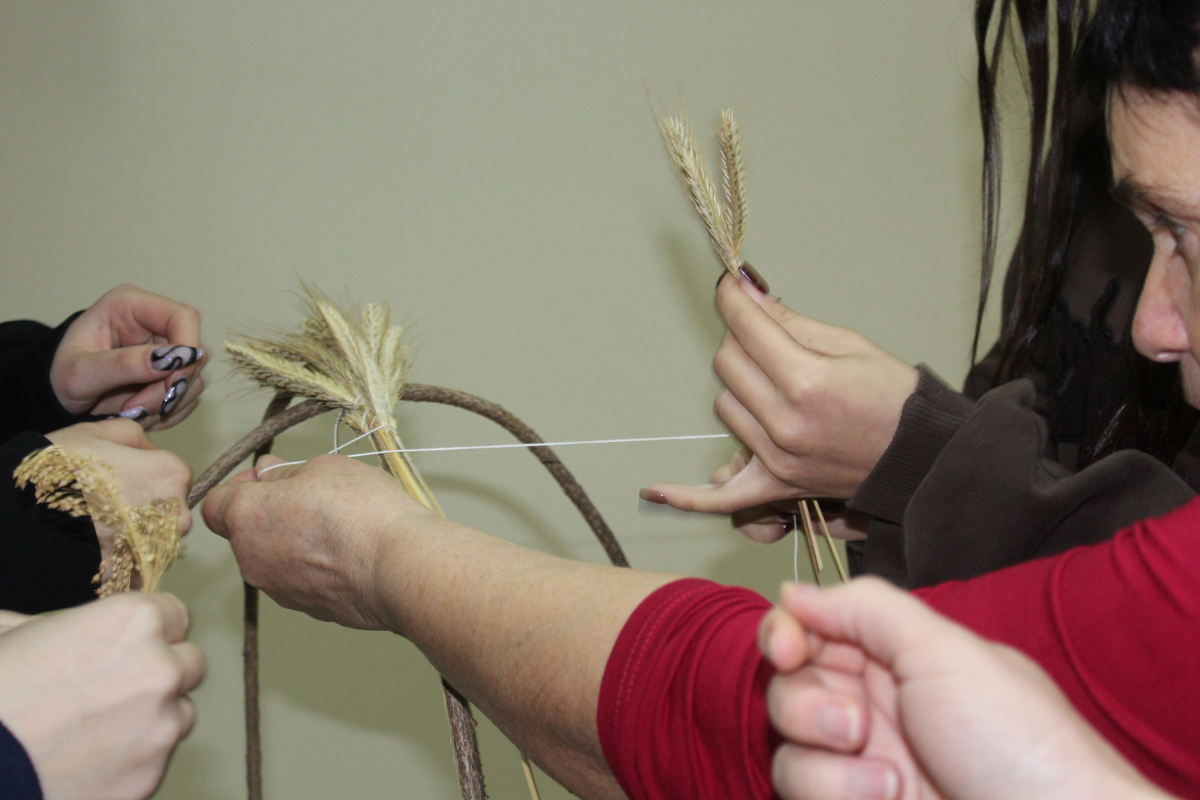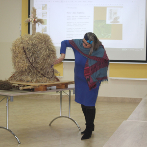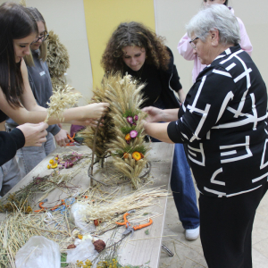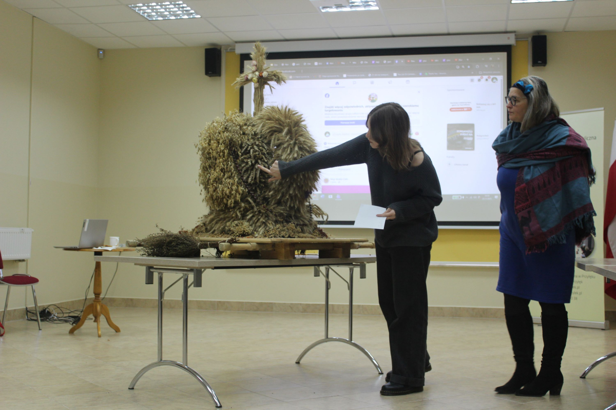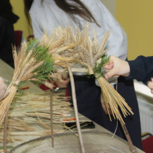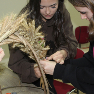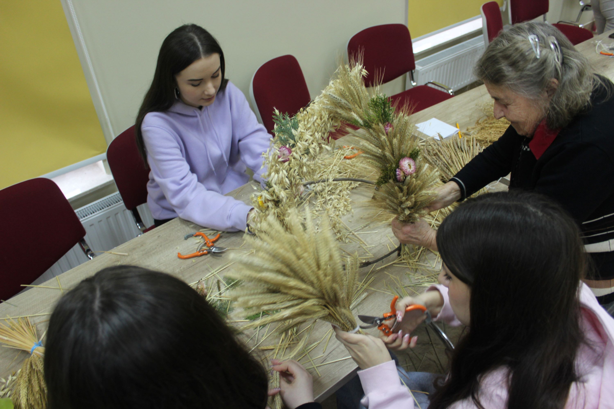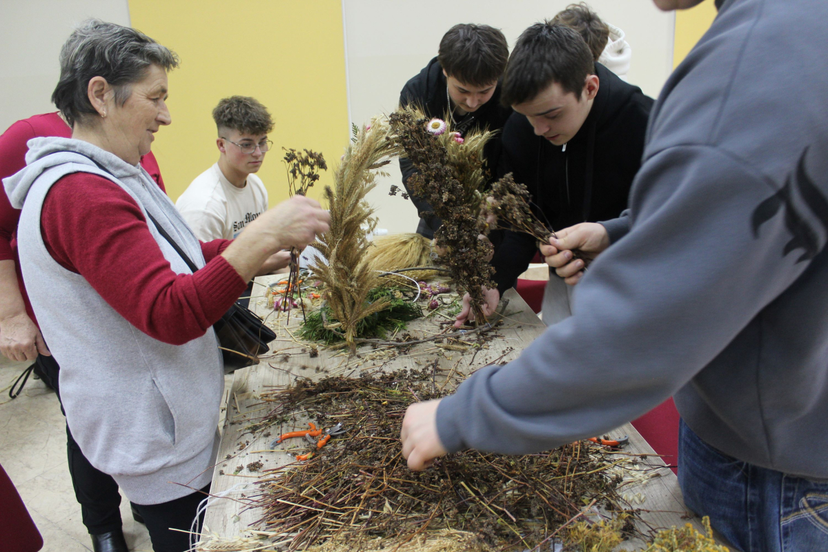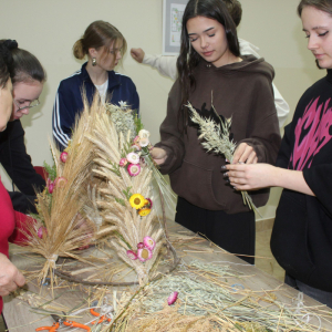 Druga część warsztatów została poprowadzona przez członkinie Koła Gospodyń Wiejskich w Łaguszowie z ponad 50-letnim doświadczeniem w wiciu wieńców, za które otrzymywały liczne nagrody. Panie wprowadziły młodzież w praktyczną stronę tradycji dożynkowych. Uczniowie uczyli się wykonywania miniaturowych wieńców dożynkowych, poznając techniki plecenia i łączenia poszczególnych elementów.