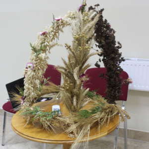 Do stworzenia tych wyjątkowych, małych kompozycji wykorzystano bogaty zestaw roślin: żyto, pszenicę, jęczmień, owies, pszenżyto, tatarkę, len, lniankę, proso, kwiaty suchołuski oraz jarzębinę. Dzięki zaangażowaniu i kreatywności uczestników powstało pięć pięknych, starannie wykonanych wieńców, które stały się efektownym zwieńczeniem wspólnych działań.