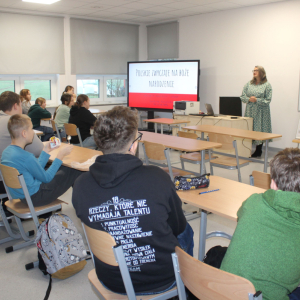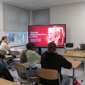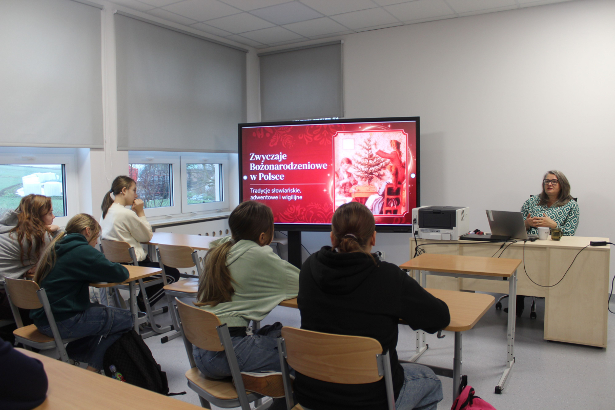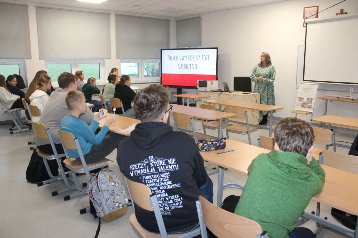 Kolejnym tematem była Wigilia, czyli najważniejszy moment polskich świąt. Uczniowie usłyszeli o symbolice opłatka, o dodatkowym nakryciu dla niespodziewanego gościa, o znaczeniu 12 potraw oraz o zwyczaju dzielenia się jedzeniem z potrzebującymi. Pojawiły się również opowieści o świątecznych wróżbach, sianku pod obrusem czy wierze, że w tym wyjątkowym czasie „zwierzęta przemawiają ludzkim głosem”.