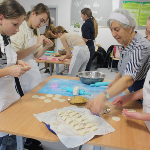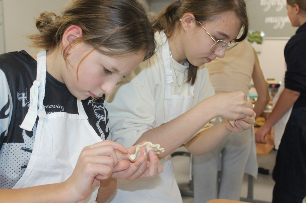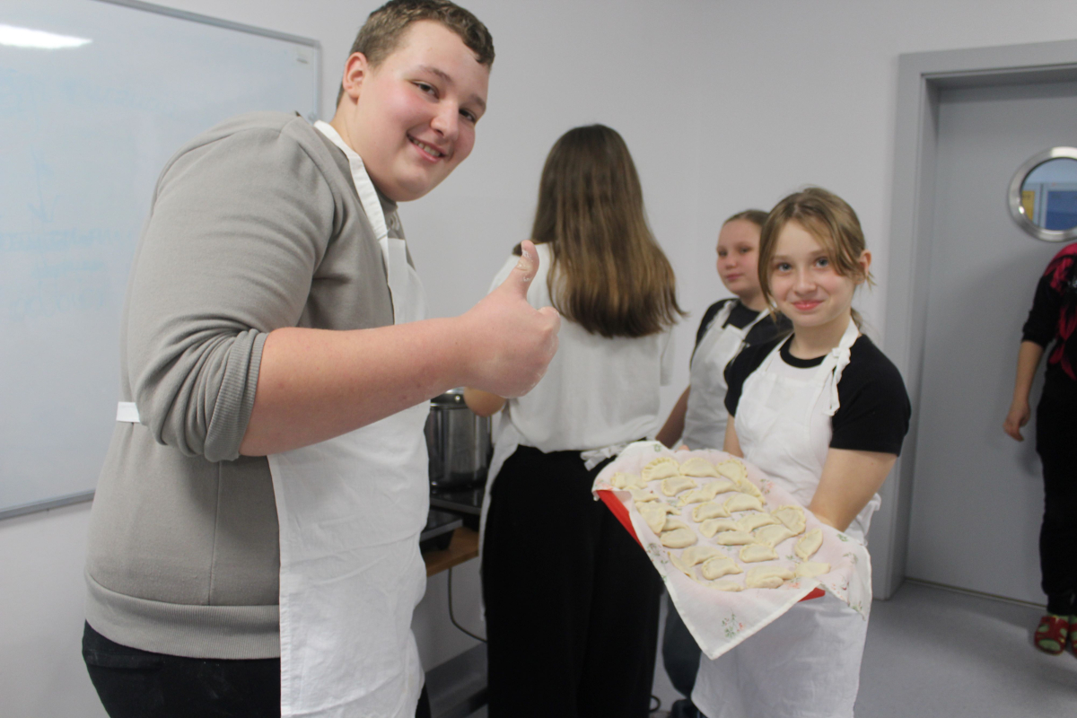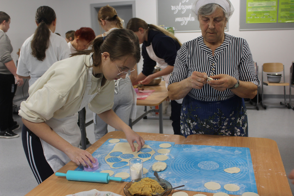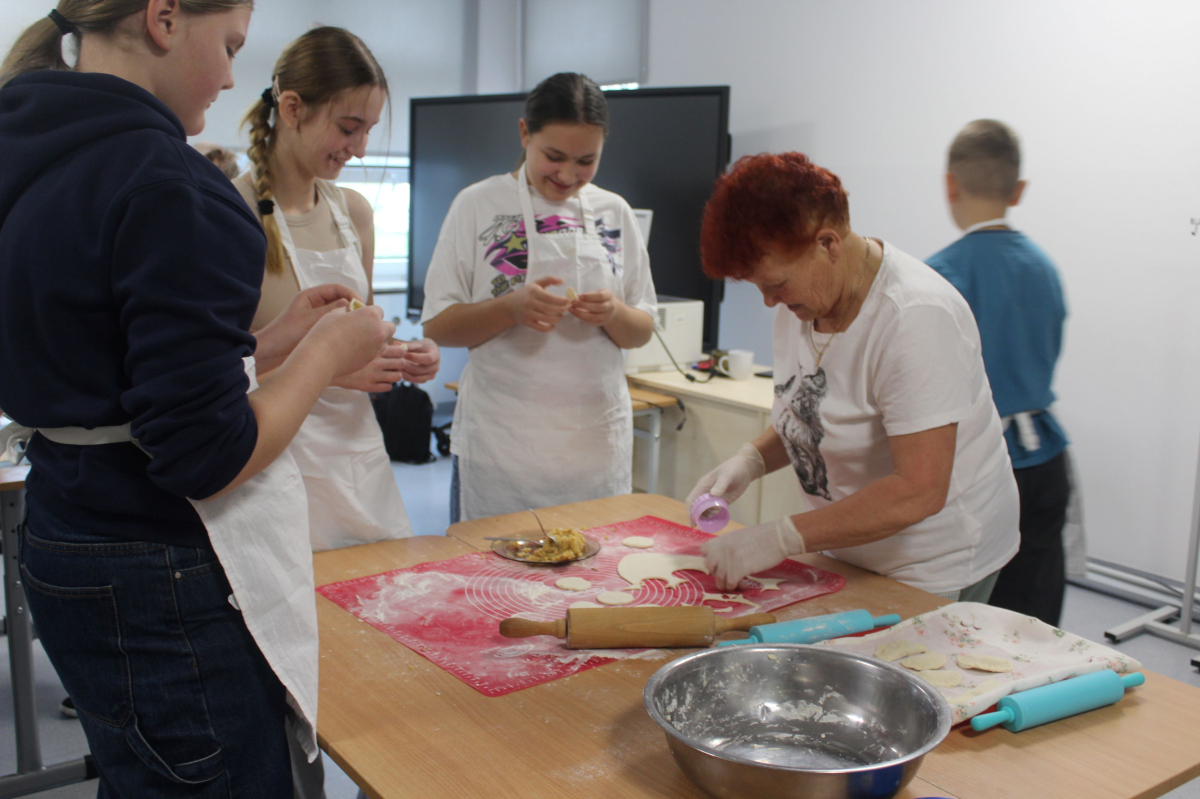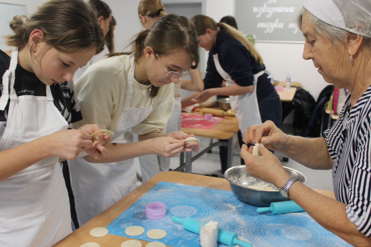 W drugiej części warsztatów odbyły się zajęcia praktyczne poprowadzone przez członkinie Koła Gospodyń Wiejskich w Rudkach. Panie podzieliły się swoją wiedzą kulinarną i wieloletnim doświadczeniem, wprowadzając młodzież w świąteczny klimat poprzez wspólne lepienie pierogów – jednego z najważniejszych dań wigilijnych.