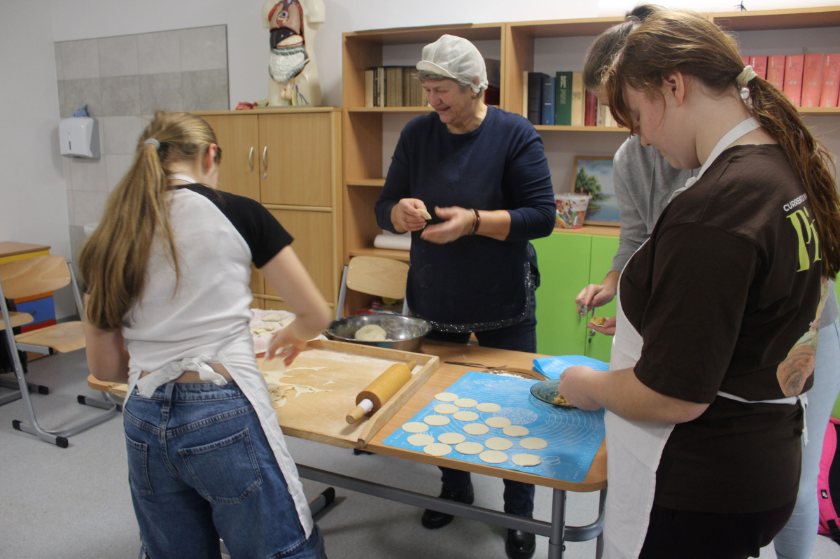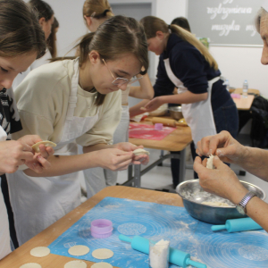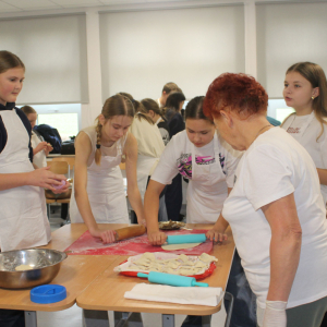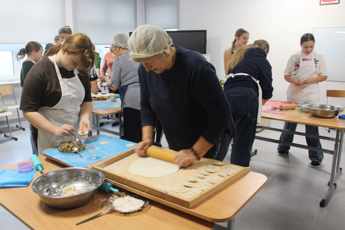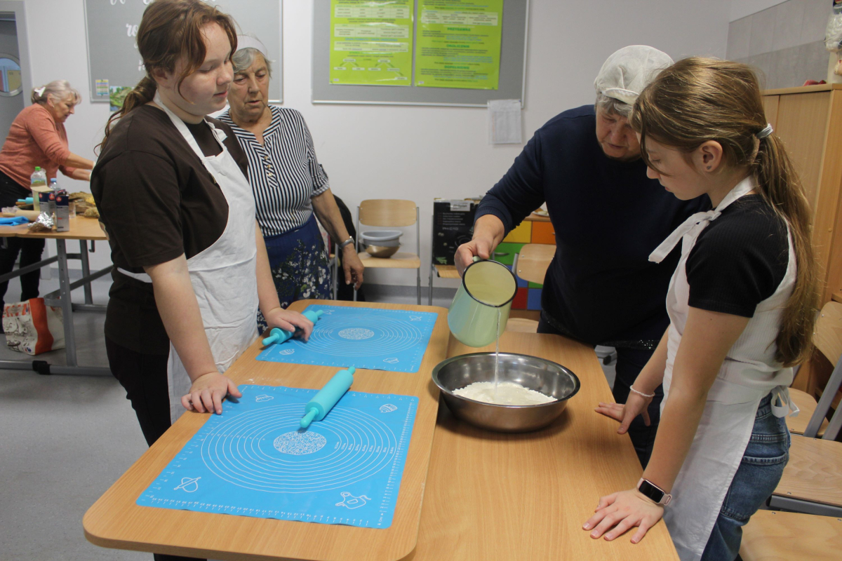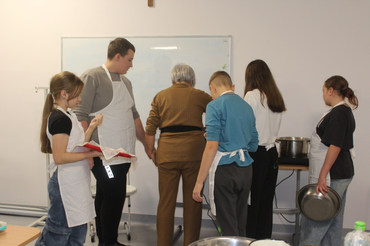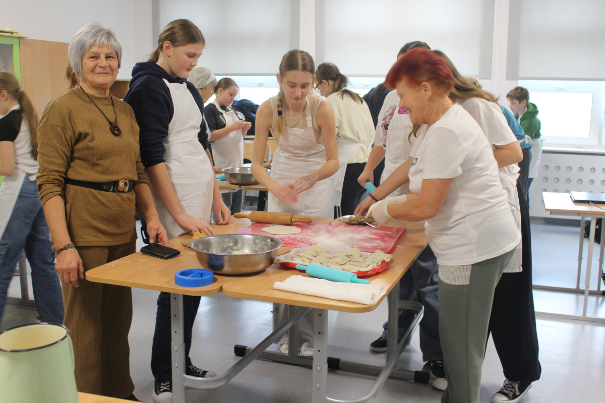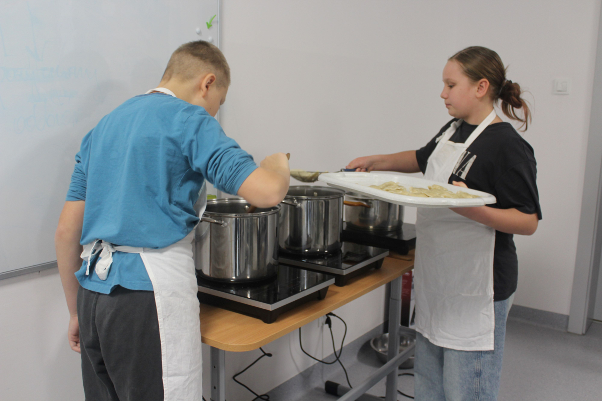 W drugiej części warsztatów odbyły się zajęcia praktyczne poprowadzone przez członkinie Koła Gospodyń Wiejskich w Rudkach. Panie podzieliły się swoją wiedzą kulinarną i wieloletnim doświadczeniem, wprowadzając młodzież w świąteczny klimat poprzez wspólne lepienie pierogów – jednego z najważniejszych dań wigilijnych.