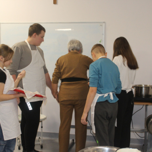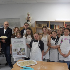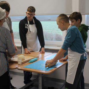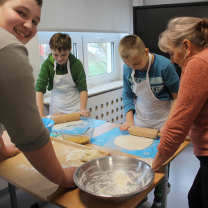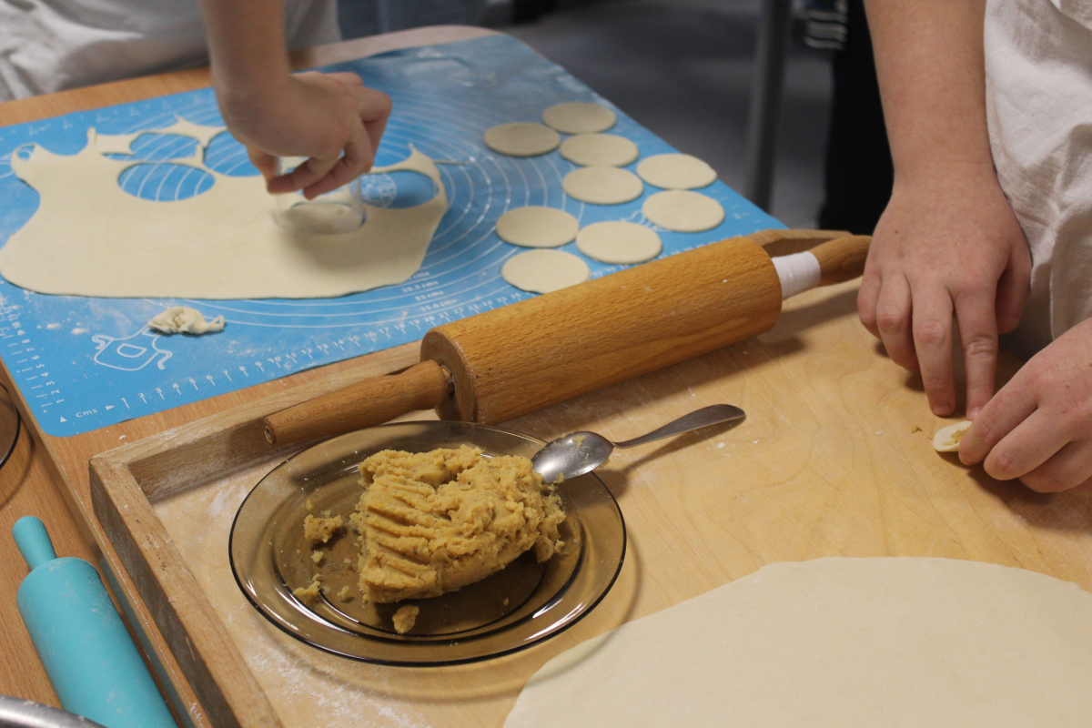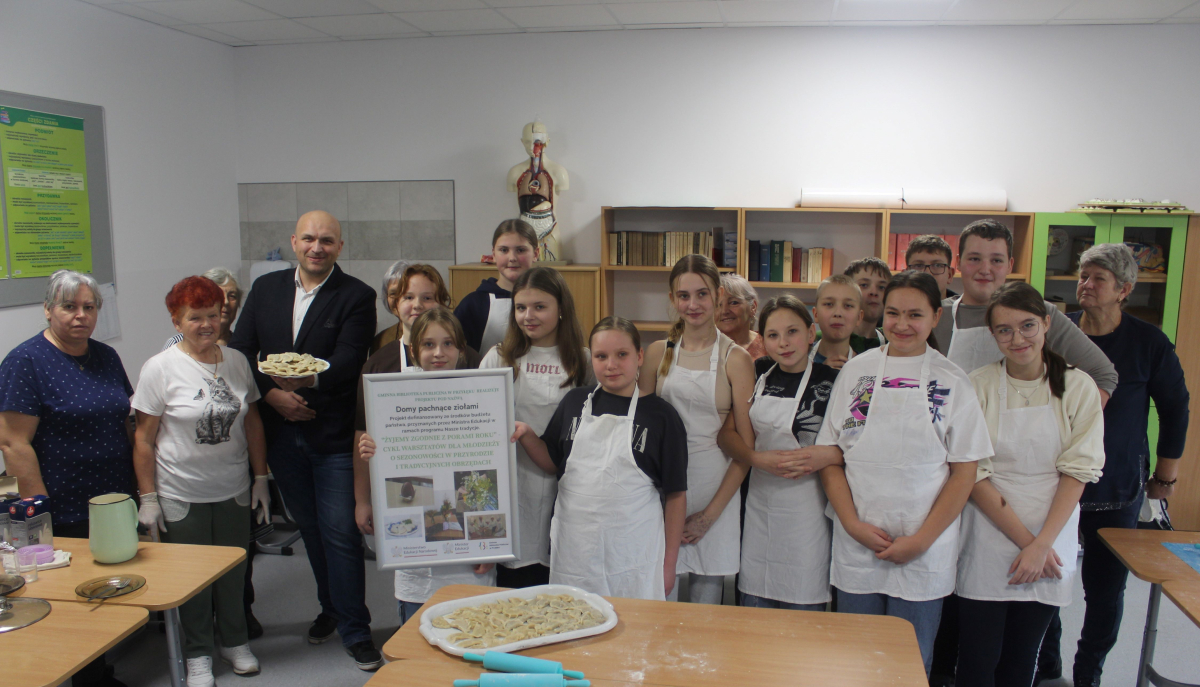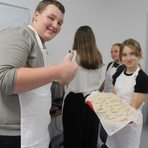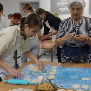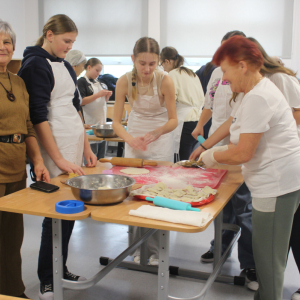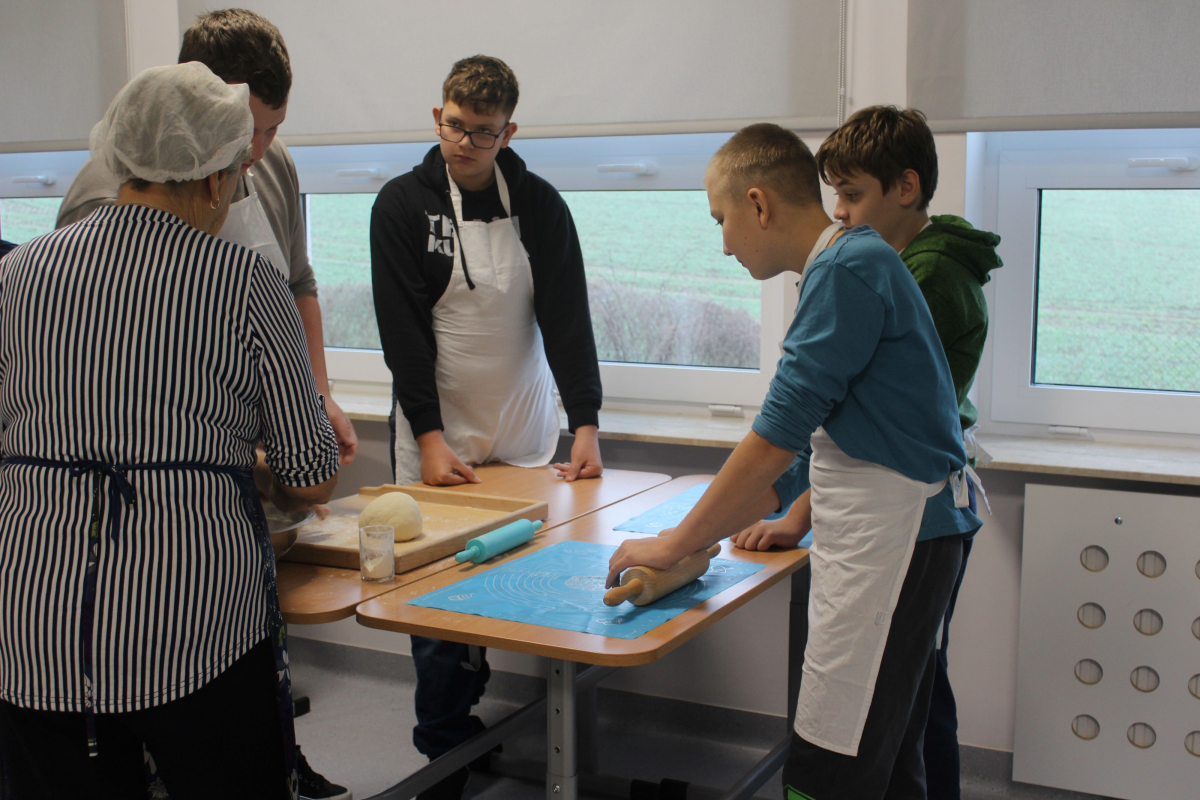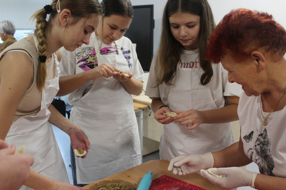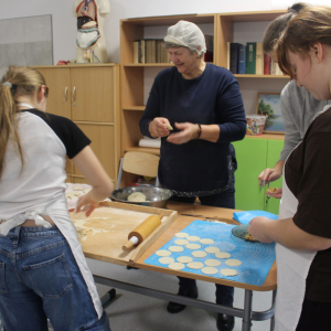 W drugiej części warsztatów odbyły się zajęcia praktyczne poprowadzone przez członkinie Koła Gospodyń Wiejskich w Rudkach. Panie podzieliły się swoją wiedzą kulinarną i wieloletnim doświadczeniem, wprowadzając młodzież w świąteczny klimat poprzez wspólne lepienie pierogów – jednego z najważniejszych dań wigilijnych.