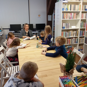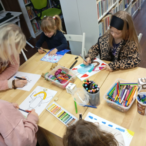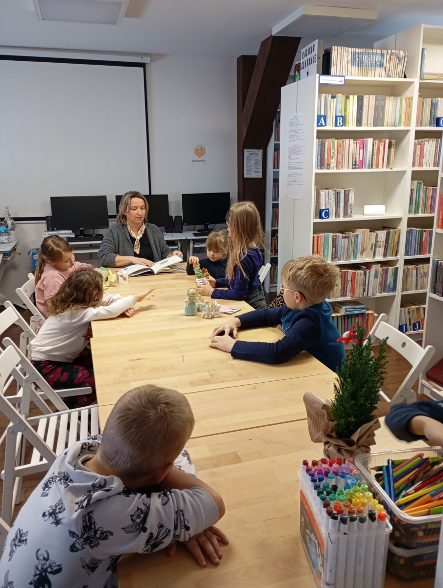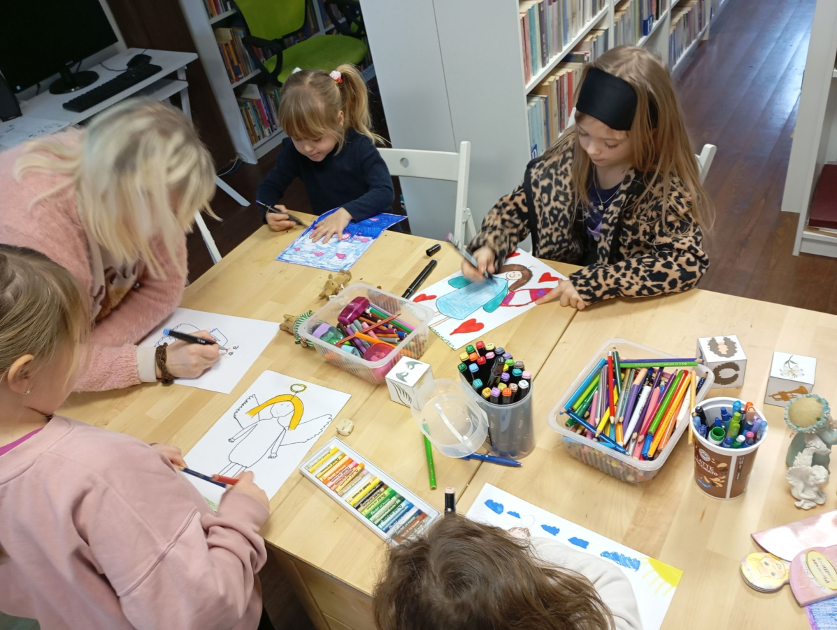 Na kolejnym zimowym spotkaniu zagościła wyjątkowa, pełna ciepła i wyobraźni atmosfera. Wszystko za sprawą spotkania z Aniołami w naszej bibliotece. Na początku uczestnicy z ciekawością wysłuchały opowiadania „O Aniele, który kochał kordonki” pochodzącego z książki „12 opowieści o aniołach”. Była to historia o nietypowej anielskiej pasji, która wywołała wiele uśmiechów i zainspirowała dzieci do rozmów o tym, czym mogą zajmować się anioły, jakie mogą mieć ulubione rzeczy oraz co sprawia, że są wyjątkowe.
