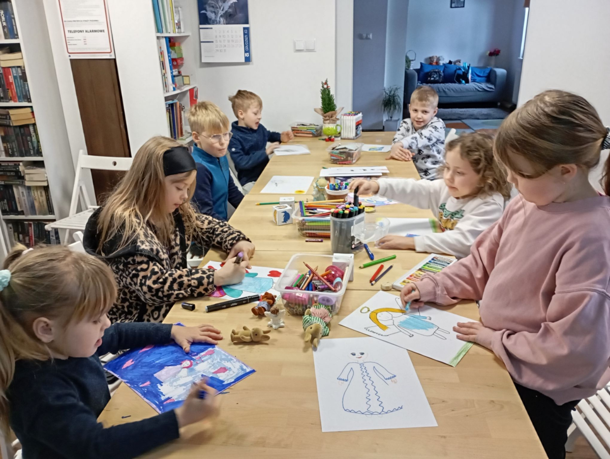 Po lekturze odbyła się wspólna dyskusja. Padło wiele pomysłów – dzieci zastanawiały się, jak wyglądają anioły, jakie mają cechy charakteru, czy potrafią pomagać i opiekować się ludźmi, a może mają swoje tajemnice i marzenia. Rozmowa rozbudziła wyobraźnię młodych uczestników do tego stopnia, że od razu przeszli do kolejnej części zajęć.