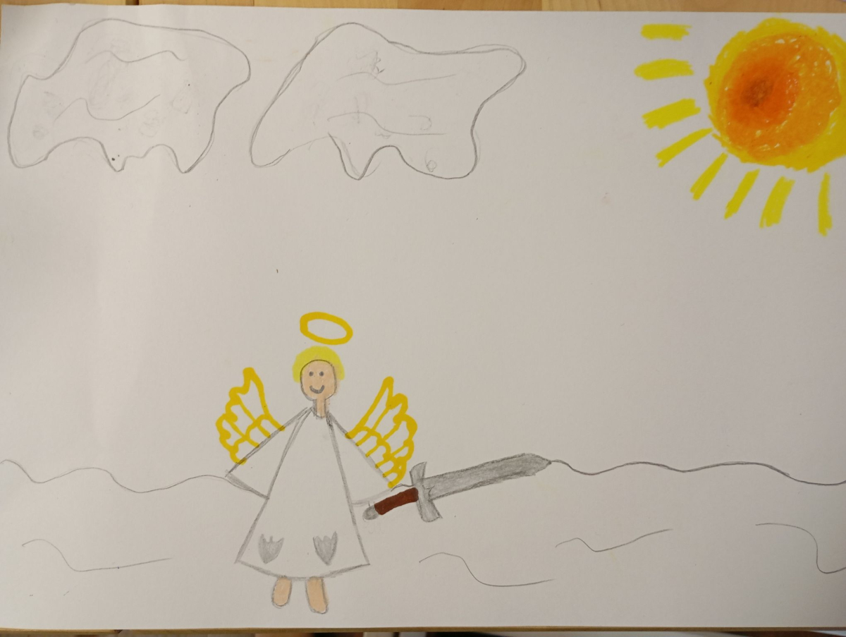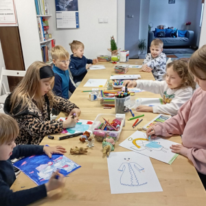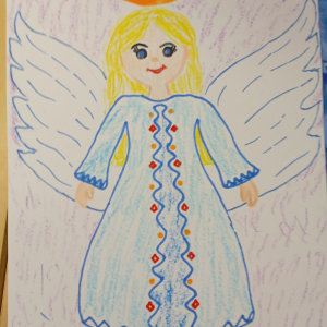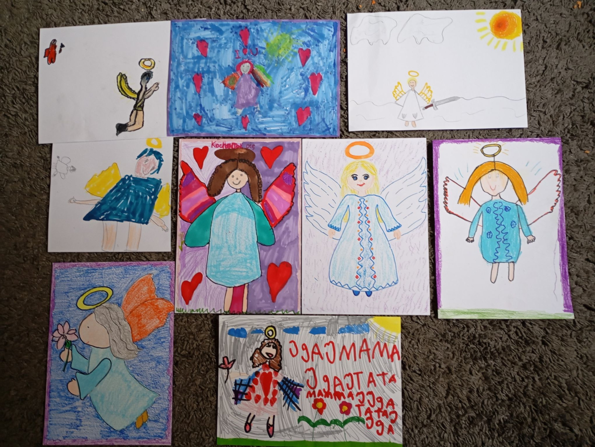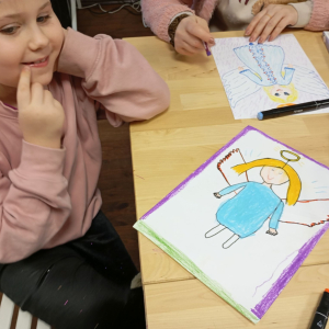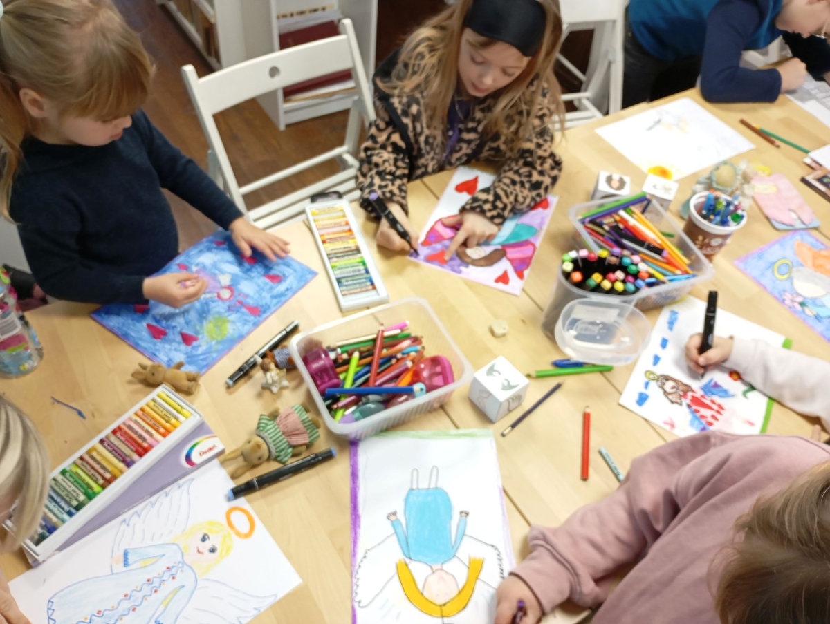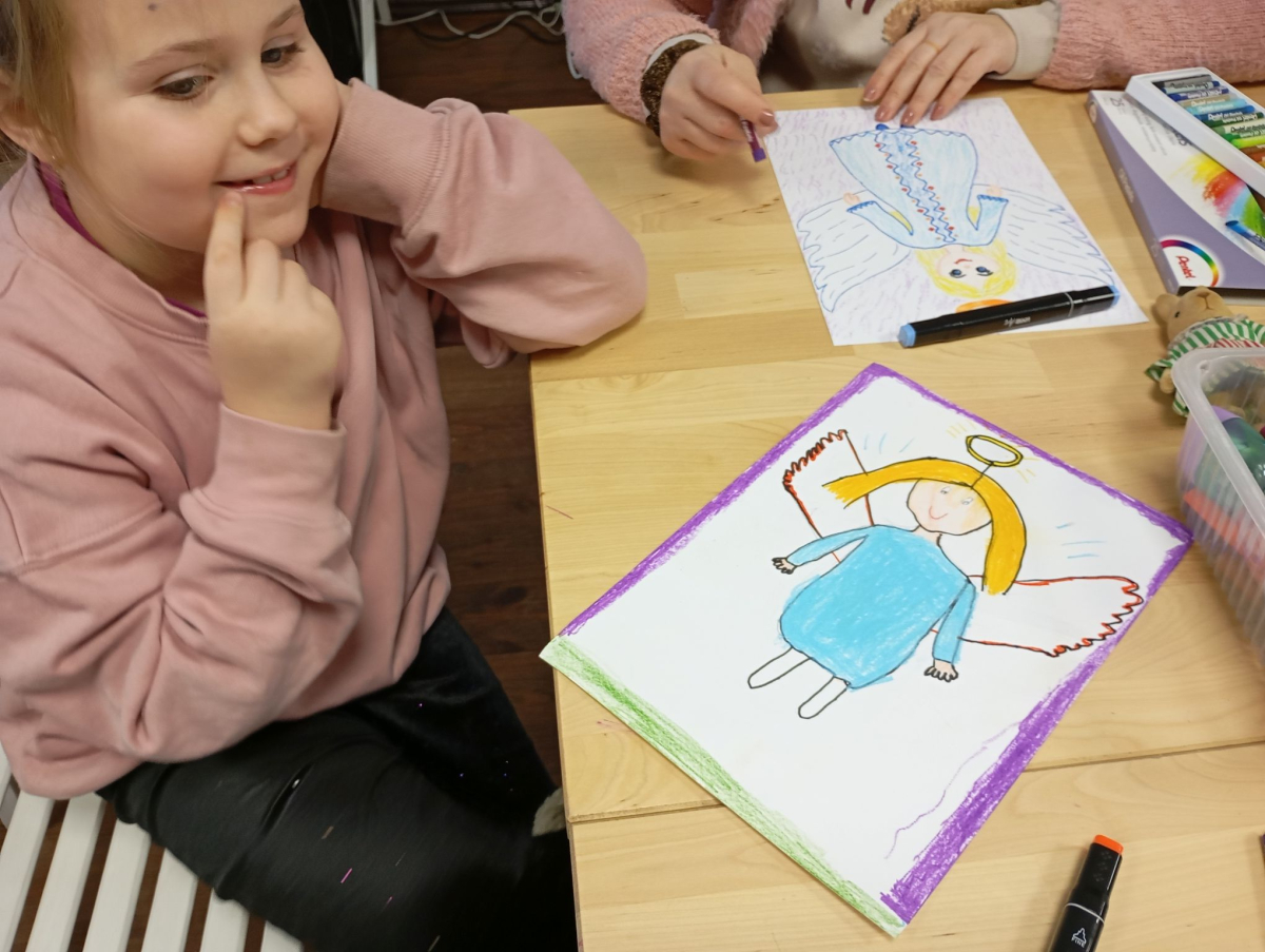 Następnie rozpoczął się warsztat rysowania aniołów, który okazał się prawdziwą artystyczną przygodą. Każde z dzieci mogło stworzyć swoją własną, niepowtarzalną wizję anioła. W ruch poszły kredki, flamastry i kartki – młodzi twórcy z ogromną pomysłowością przenosili swoje idee na papier. Jedne anioły były klasyczne – w jasnych szatach i z delikatnymi skrzydłami, inne bardziej fantazyjne – pełne kolorów, ozdób i wesołych szczegółów. Każdy rysunek miał swój charakter i historię.