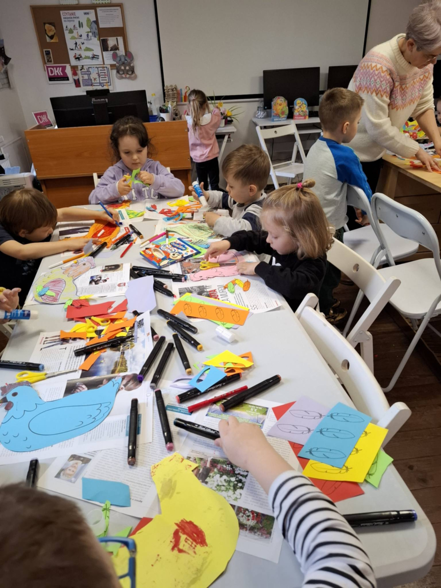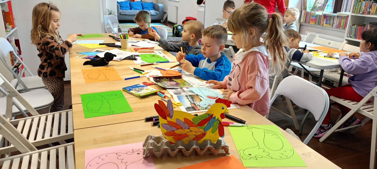 W drugiej części warsztatów przedszkolaki wzięły udział w zajęciach plastycznych. Każde dziecko wykonało własnoręcznie stojaczek na pisanki w formie kolorowej kurki. Powstały barwne i kreatywne prace, które z pewnością będą piękną ozdobą wielkanocnych stołów. Warsztaty przebiegły w miłej atmosferze, a dzieci wróciły do swoich zajęć z uśmiechami i nową wiedzą o świątecznych tradycjach.