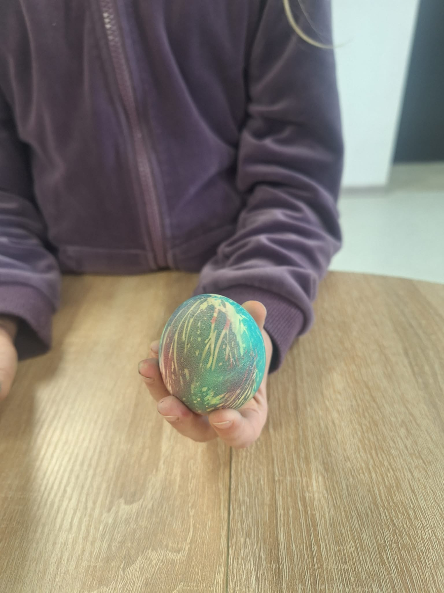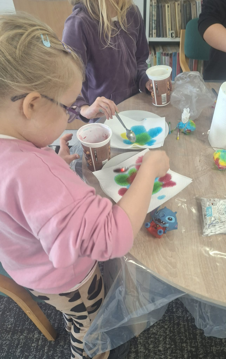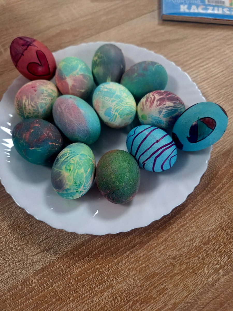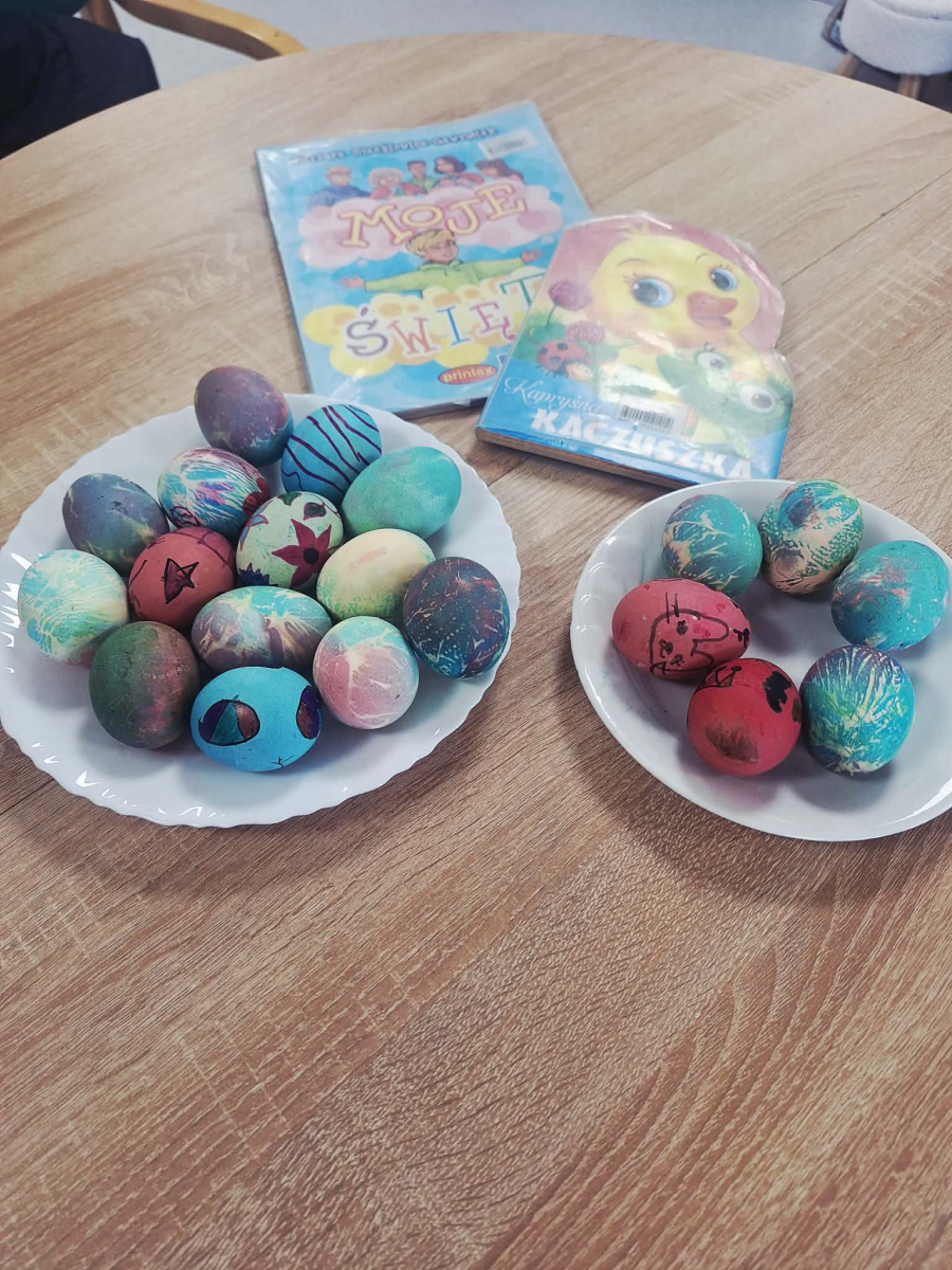 Po części literackiej dzieci przystąpiły do malowania pisanek. Każde z nich mogło samodzielnie ozdobić swoje jajko według własnego pomysłu. Do dyspozycji były kolorowe materiały plastyczne – farbki oraz pisaki. Mali artyści wykazali się ogromną pomysłowością, tworząc barwne i oryginalne wzory.Atmosfera podczas spotkania była niezwykle radosna i twórcza.