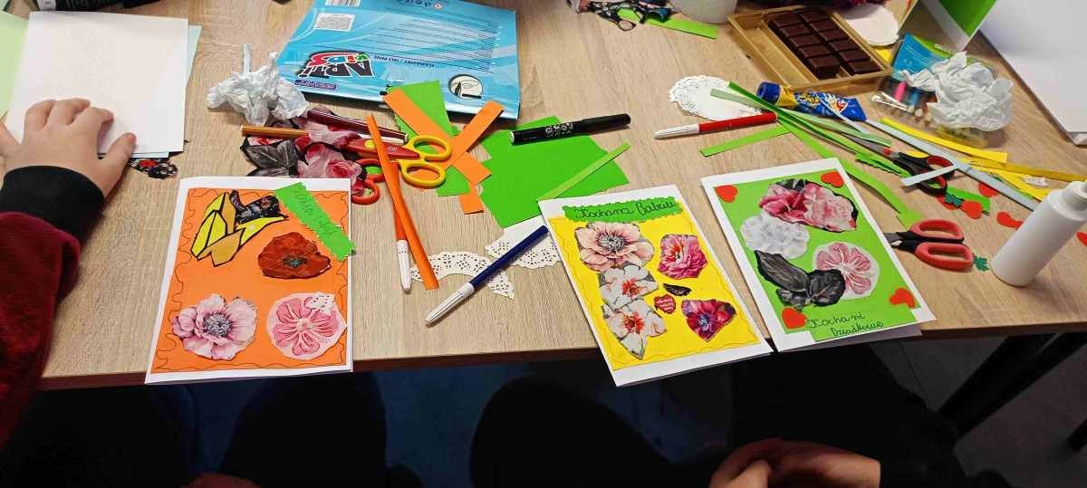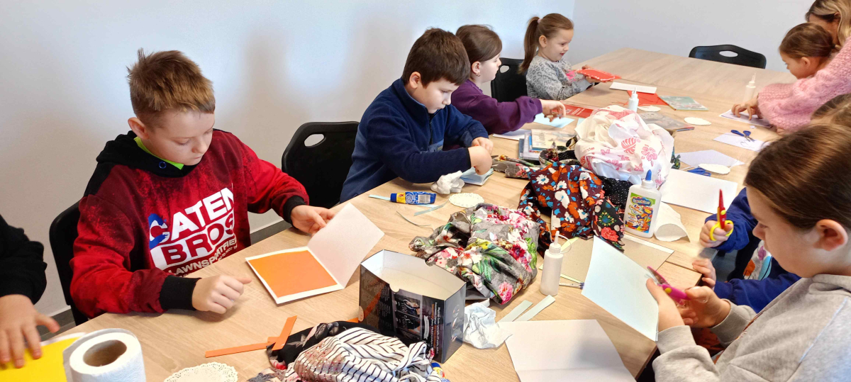 Podczas pierwszego warsztatu uczestnicy tworzyli laurki z okazji Dnia Babci i Dziadka. Dzieci z ogromnym zaangażowaniem ozdabiały swoje prace kolorowymi papierami, wstążkami, brokatem oraz innymi materiałami plastycznymi. Każda laurka była niepowtarzalna i pełna serca – powstawały prace, które z pewnością sprawiły wiele radości obdarowanym seniorom. Zajęcia były także okazją do rozmów o rodzinie, szacunku do starszych oraz znaczeniu międzypokoleniowych więzi.
