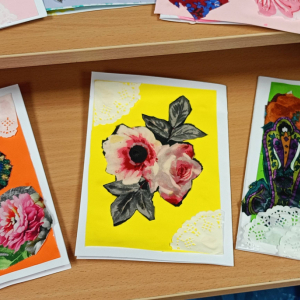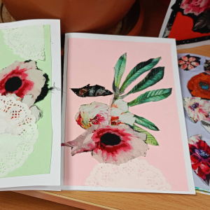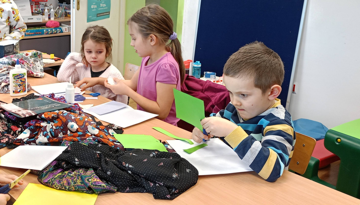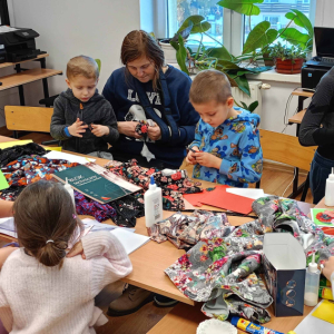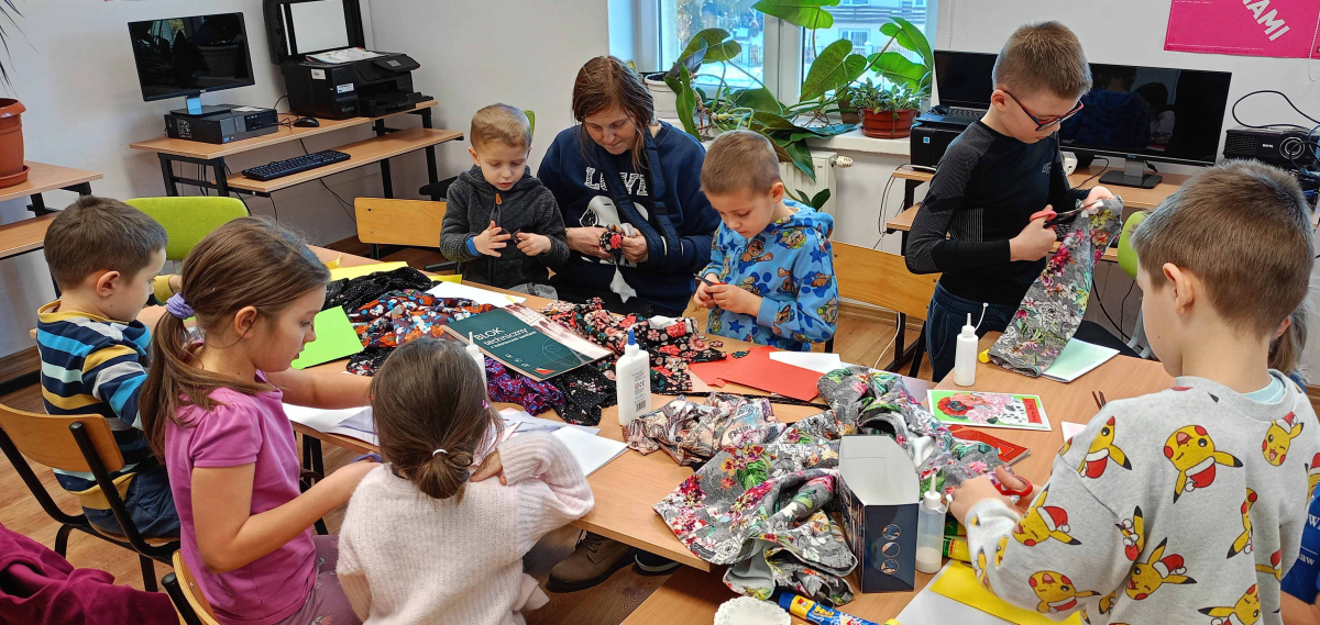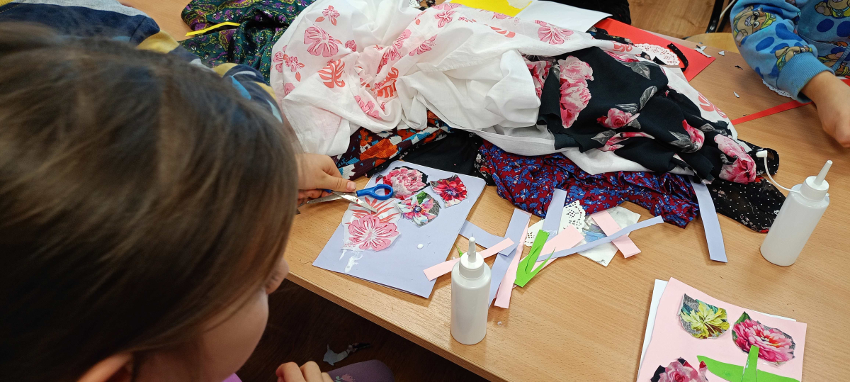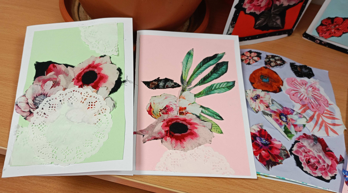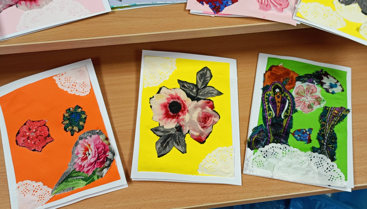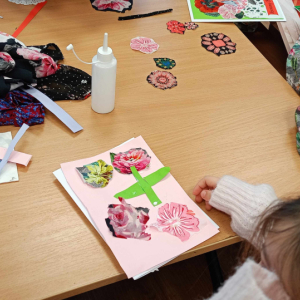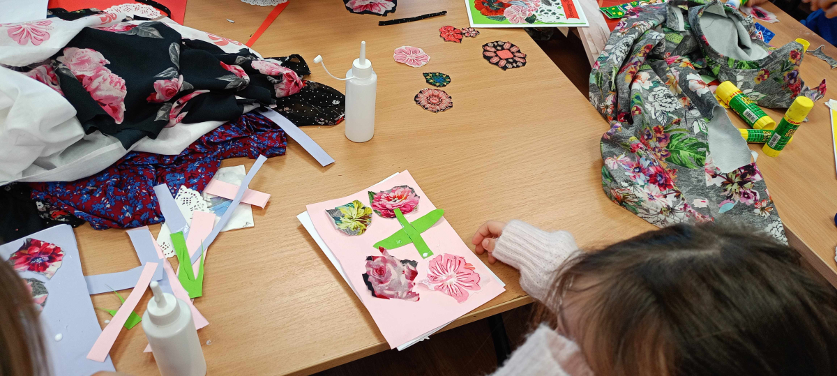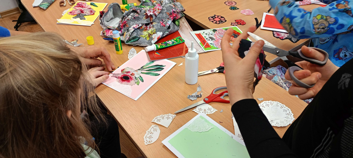 W części warsztatowej mali artyści przystąpili do wykonania własnoręcznych laurek dla swoich bliskich. Kartki były ozdabiane fragmentami materiałów w kwiatowe wzory, kolorowym papierem i innymi dekoracjami. Każda praca była niepowtarzalna i wykonana z ogromnym zaangażowaniem oraz sercem.