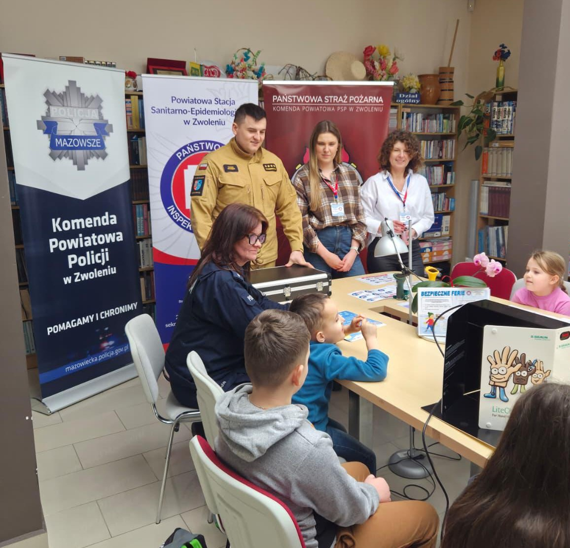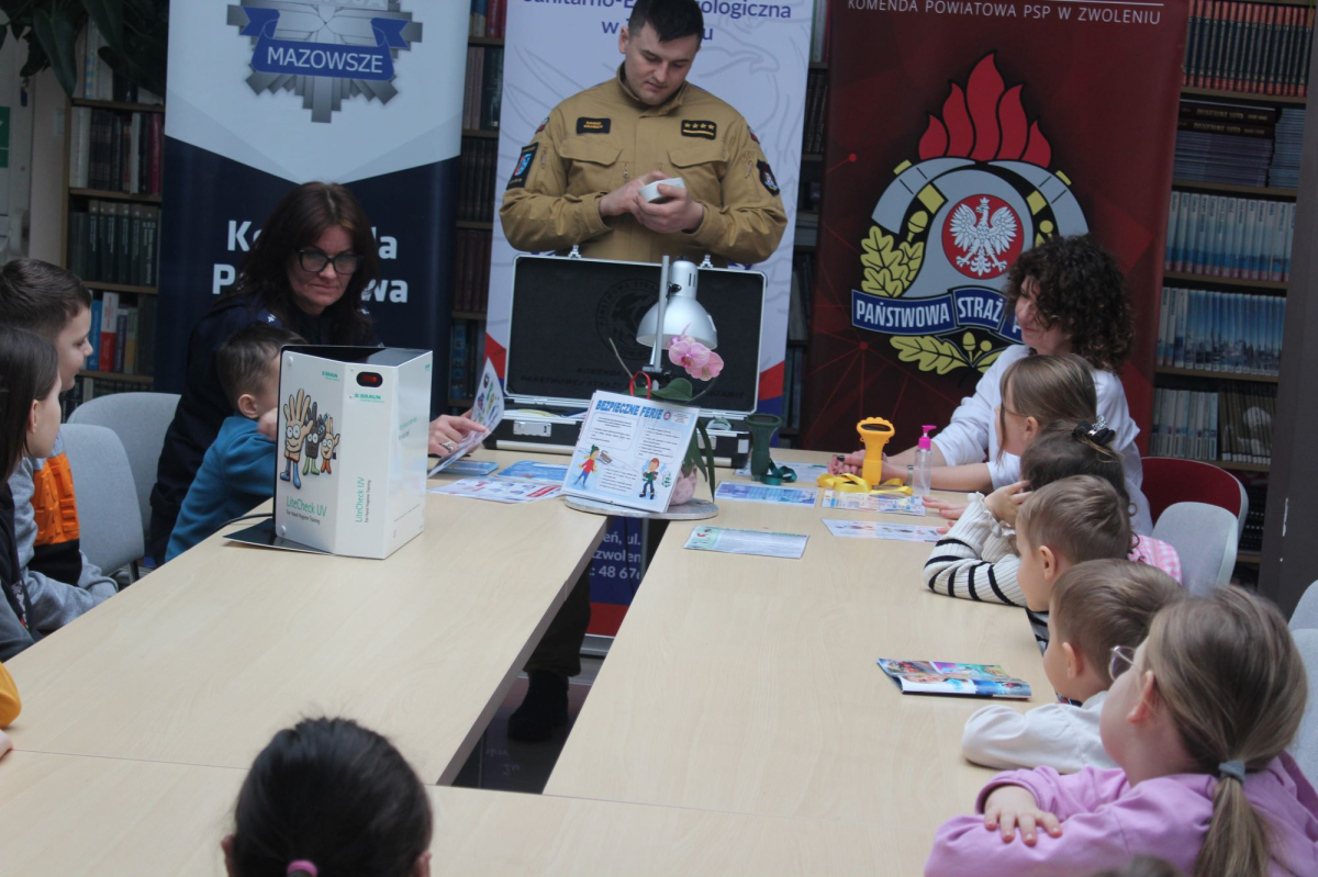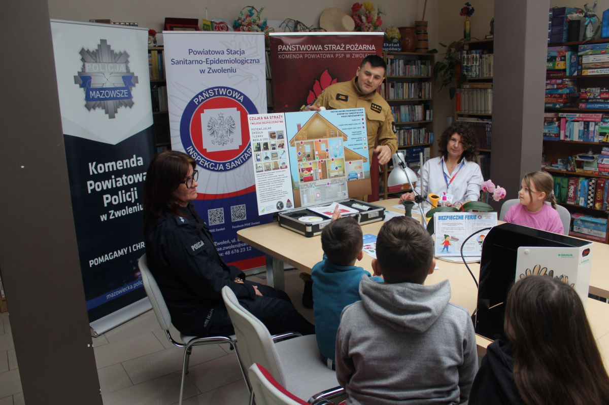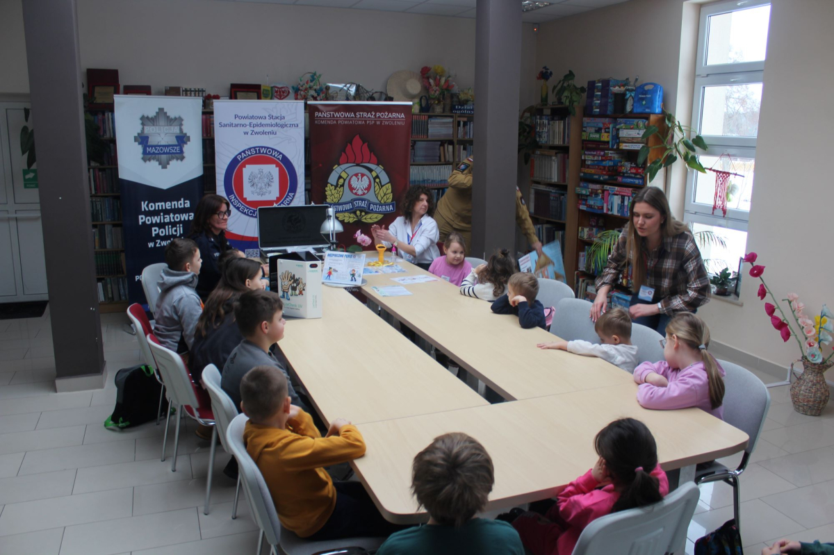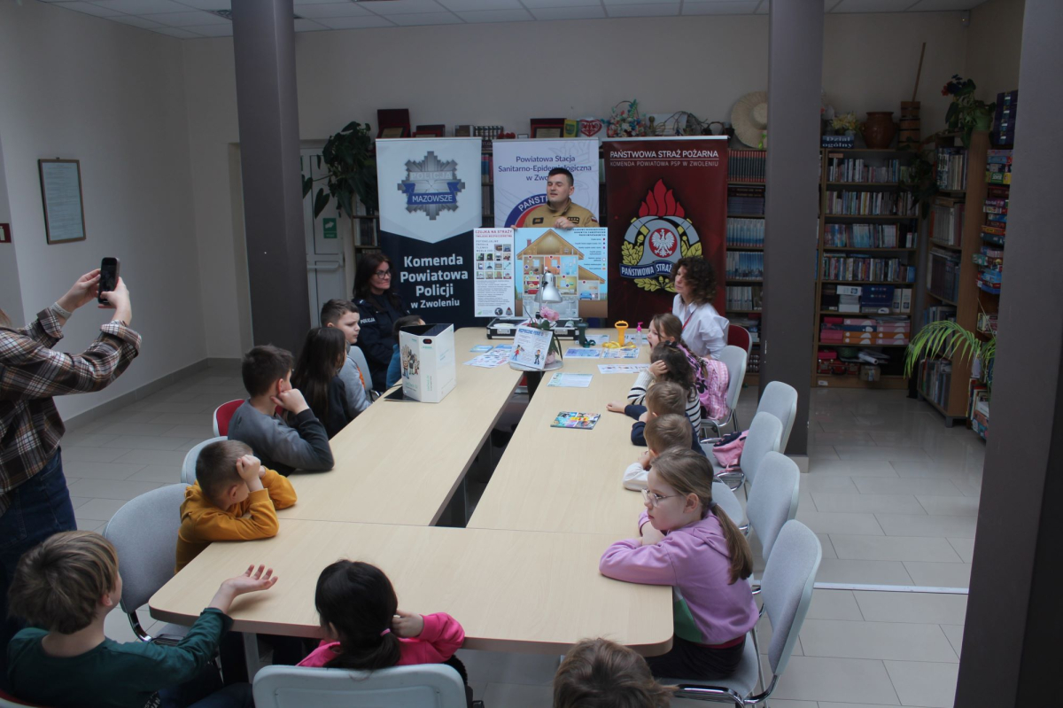W drugim tygodniu ferii zimowych w bibliotece odbyło się spotkanie edukacyjne dla dzieci, poświęcone zagadnieniom bezpieczeństwa i profilaktyki zdrowotnej. Zajęcia poprowadziły przedstawicielki Powiatowej Stacji Sanitarno-Epidemiologicznej w Zwoleniu, funkcjonariusz Państwowej Straży Pożarnej – kpt. Krzysztof Gregorczyk oraz funkcjonariuszka Komendy Powiatowej Policji w Zwoleniu – sierż. Katarzyna Cieślik.