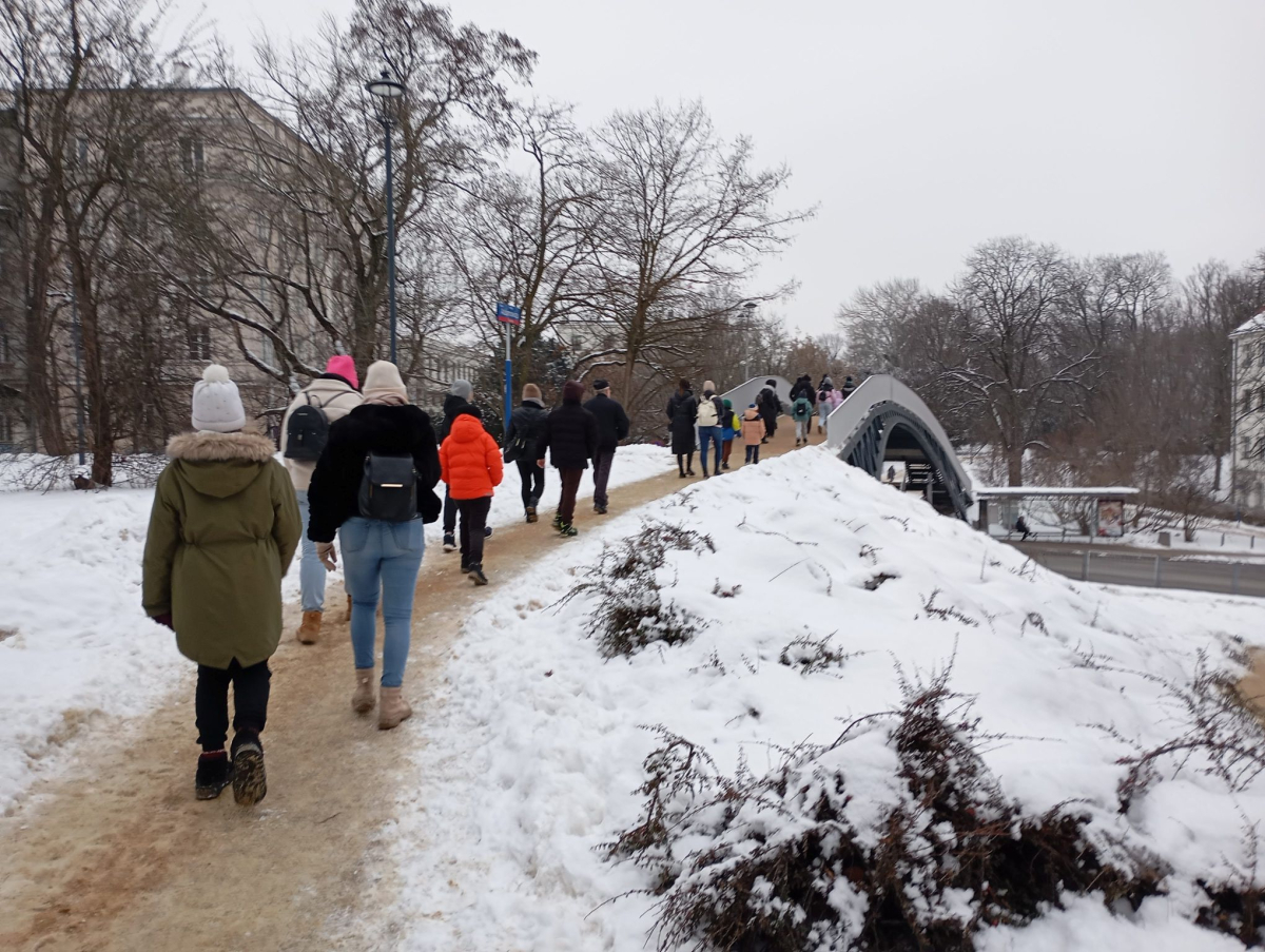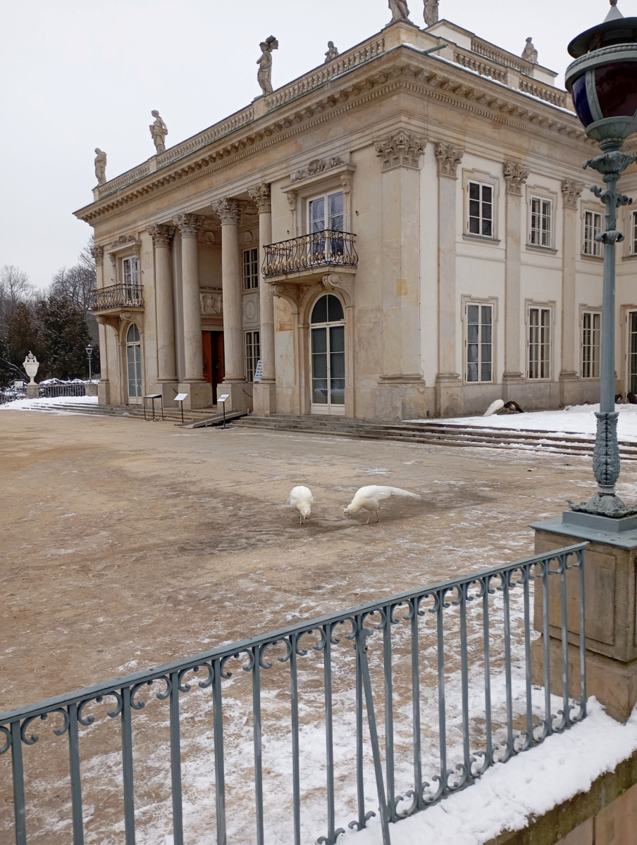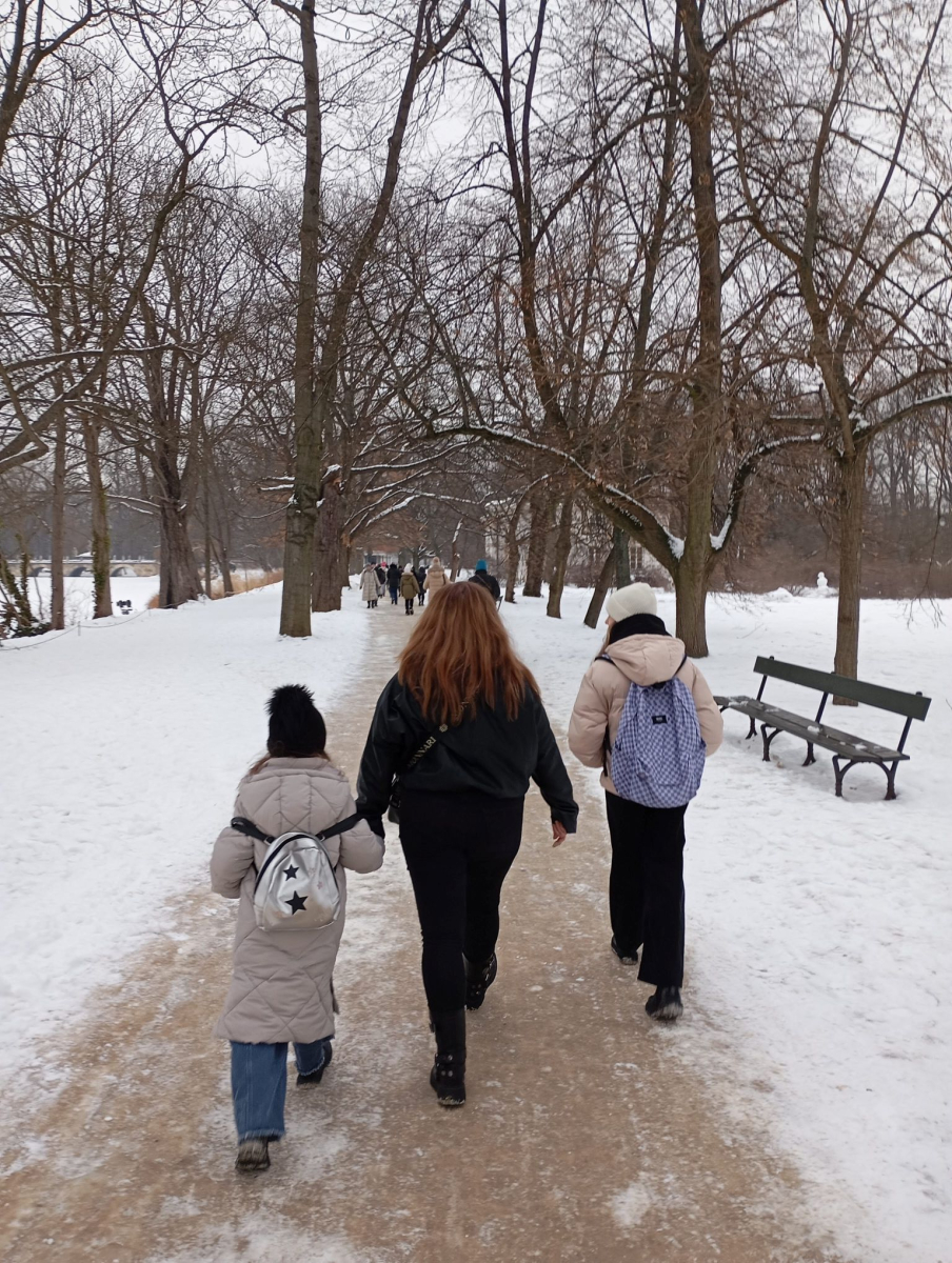 Następnie przenieśliśmy się do zimowej pocztówki z Warszawy – Łazienek Królewskich. Białe alejki, lekko skrzypiący pod butami śnieg, pałace odbijające się w tafli zamarzniętej wody… Spacer w takiej scenerii miał w sobie coś magicznego. Był czas na zwiedzanie, rodzinne rozmowy, pamiątkowe zdjęcia.