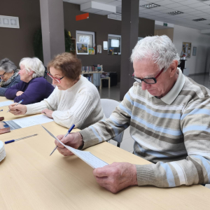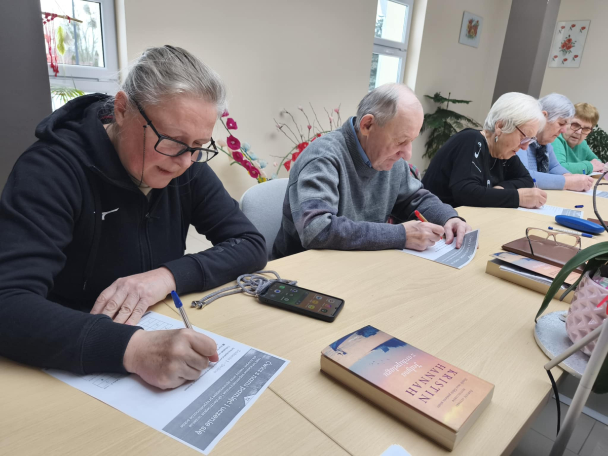 Przy słodkim poczęstunku nasi seniorzy z dużym zaangażowaniem rozwiązywali różnorodne zadania wspierające pamięć oraz koncentrację. Ćwiczenia obejmowały łamigłówki słowne, zadania logiczne, trening zapamiętywania oraz krótkie ćwiczenia skojarzeniowe, które nie tylko pobudzały umysł, ale także wywoływały wiele uśmiechów i pozytywnych emocji. Podczas zajęć wykorzystane zostały materiały Fundacji Stocznia „Ćwiczenia z głową”, które stanowiły doskonałą bazę do treningu umysłu.