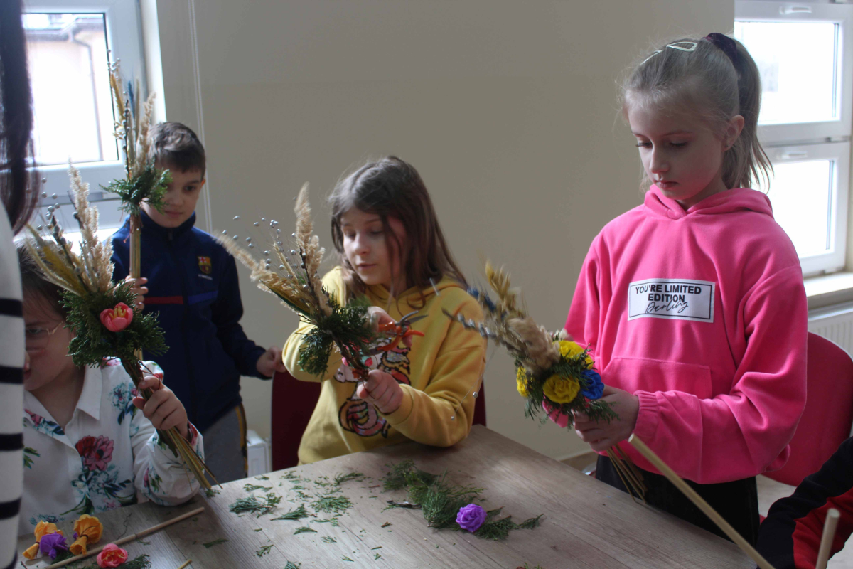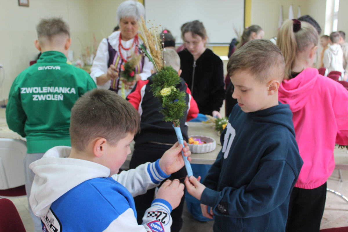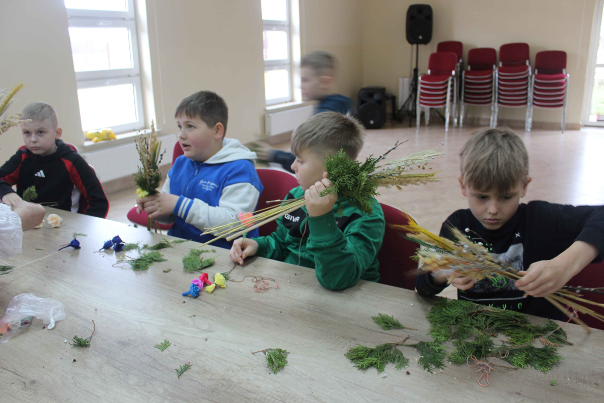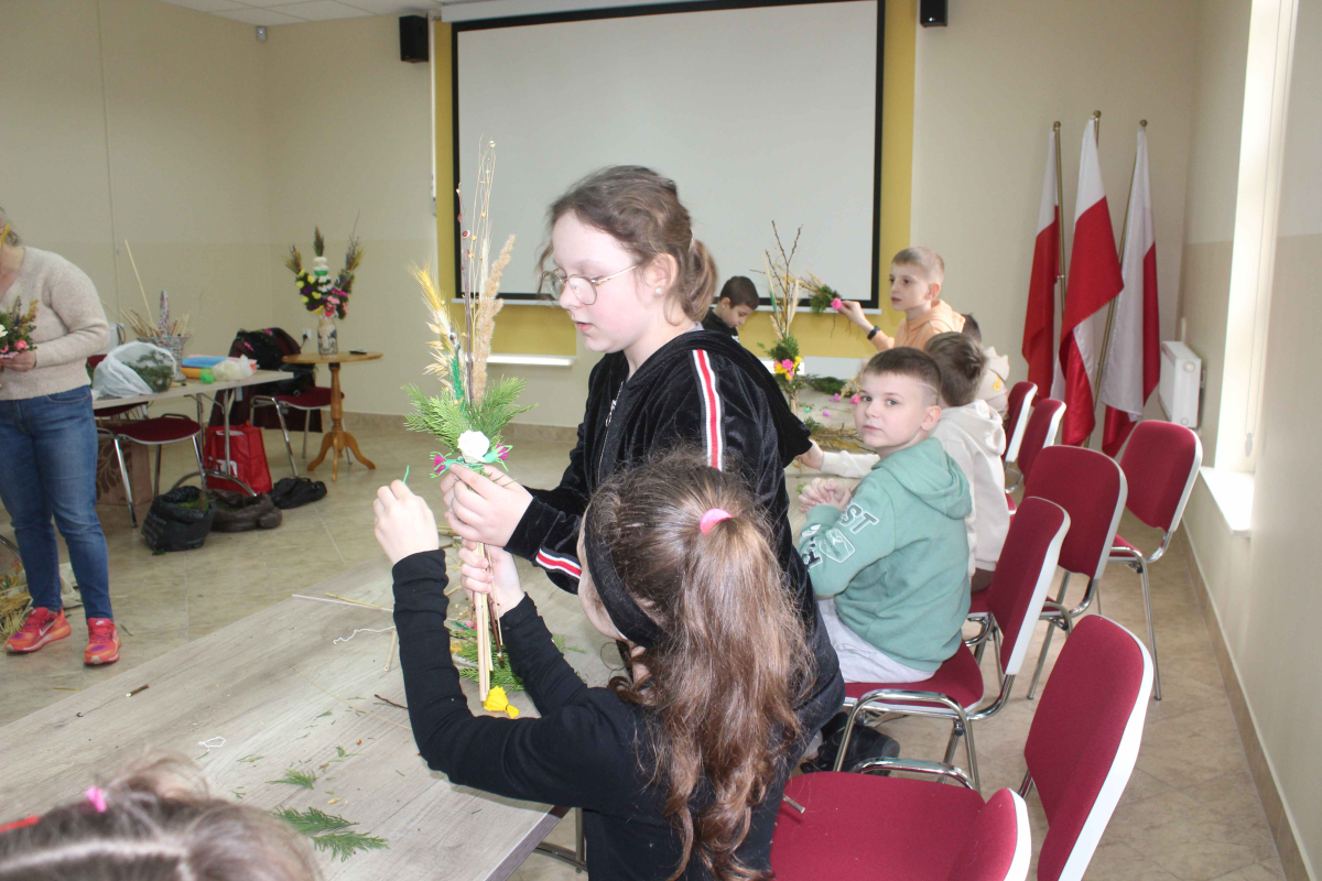 W tym samym czasie starsi uczniowie z klas drugiej i trzeciej, pod czujnym okiem członkiń Koła, tworzyli tradycyjne palmy wielkanocne. Kolorowe kwiaty, gałązki i starannie dobrane zioła sprawiły, że każda palma była wyjątkowa. Powstałe prace zachwycały pomysłowością i wprowadzały do biblioteki prawdziwie świąteczny klimat.