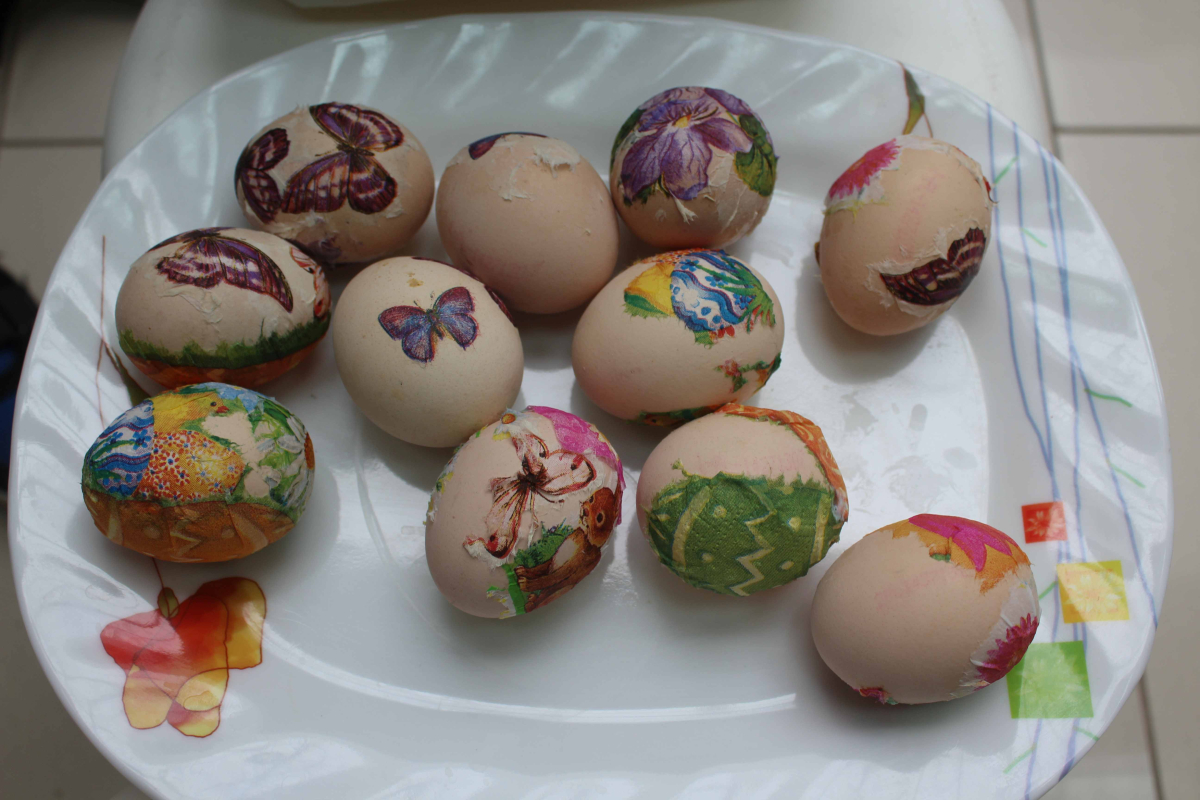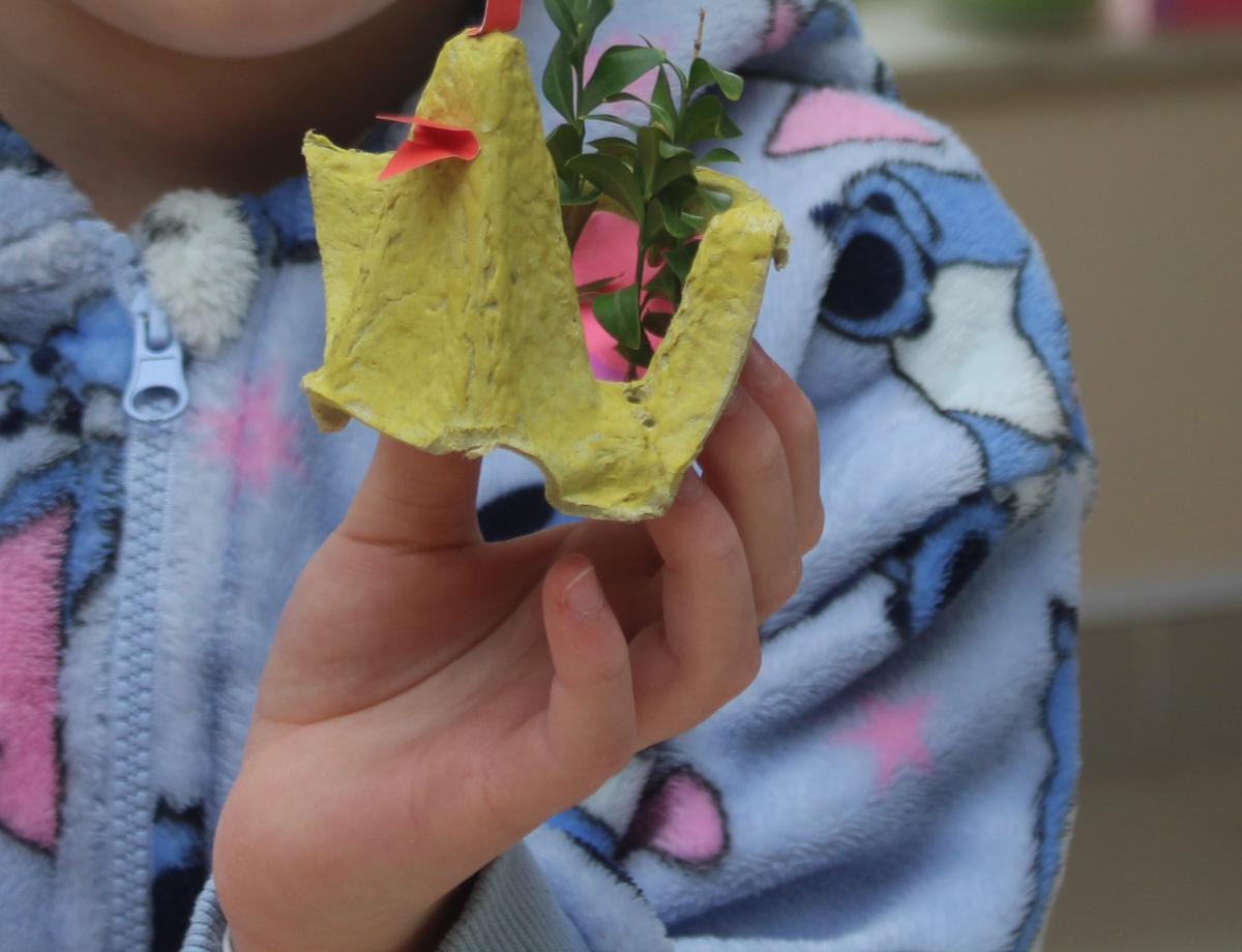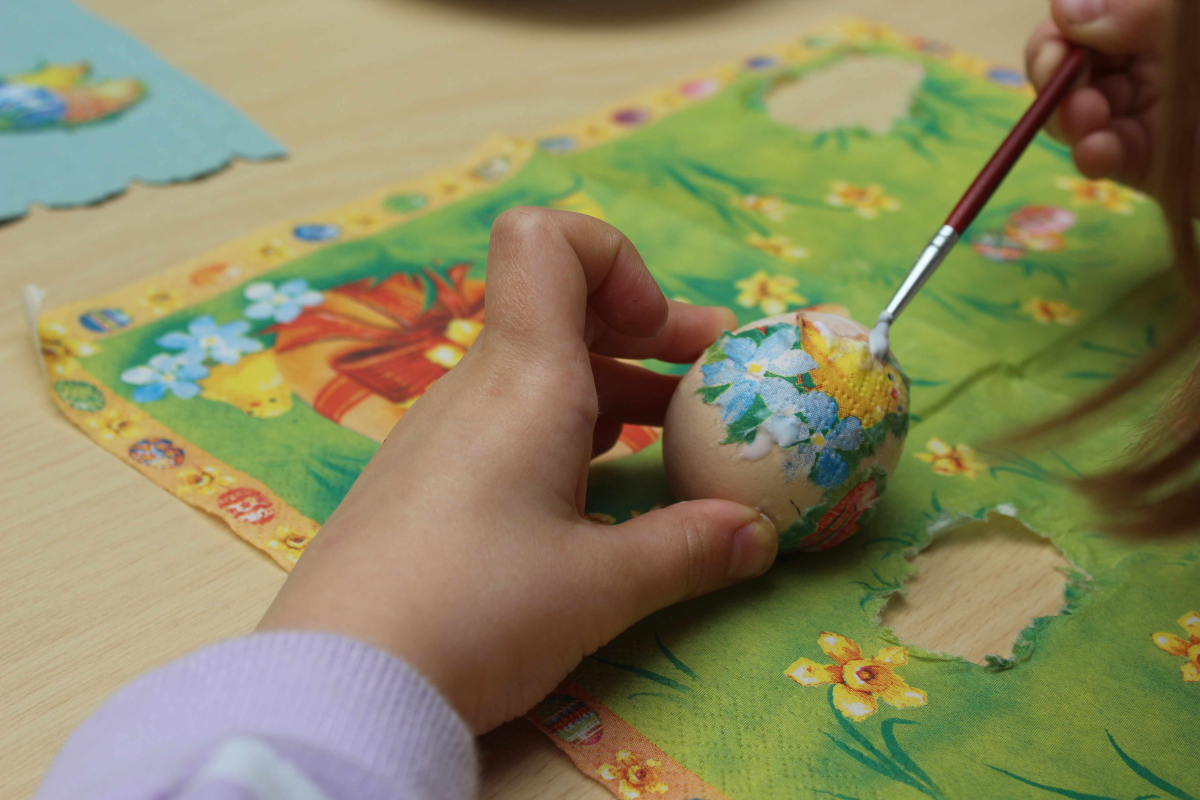 Po tej inspirującej części przyszedł czas na działanie. Najmłodsi uczniowie z klasy pierwszej z zapałem zabrali się za tworzenie wielkanocnych kurczaczków. Z pozornie zwykłych wytłaczanek po jajkach powstawały urocze, żółte postacie. Dzieci dodawały im bukszpanowe ogonki, a w środku umieszczały watę, na które wysiały nasiona rzeżuchy – wszystko po to, by ich prace „ożyły” i zazieleniły się na święta. Nie zabrakło także pierwszych prób zdobienia pisanek metodą decoupage, która okazała się nie tylko ciekawa, ale i dająca wiele satysfakcji.